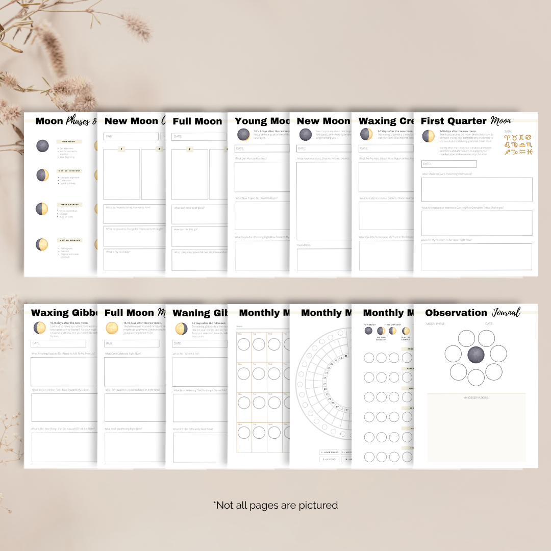 - Daily & Observation Journal Pages: Space for daily planning, goals, affirmations, and observations aligned with the moon phase.