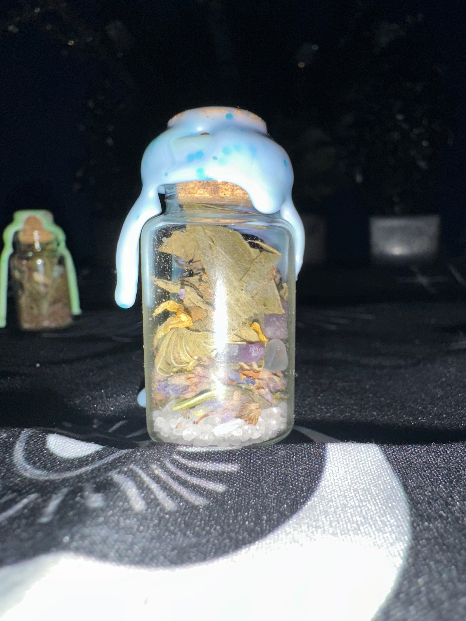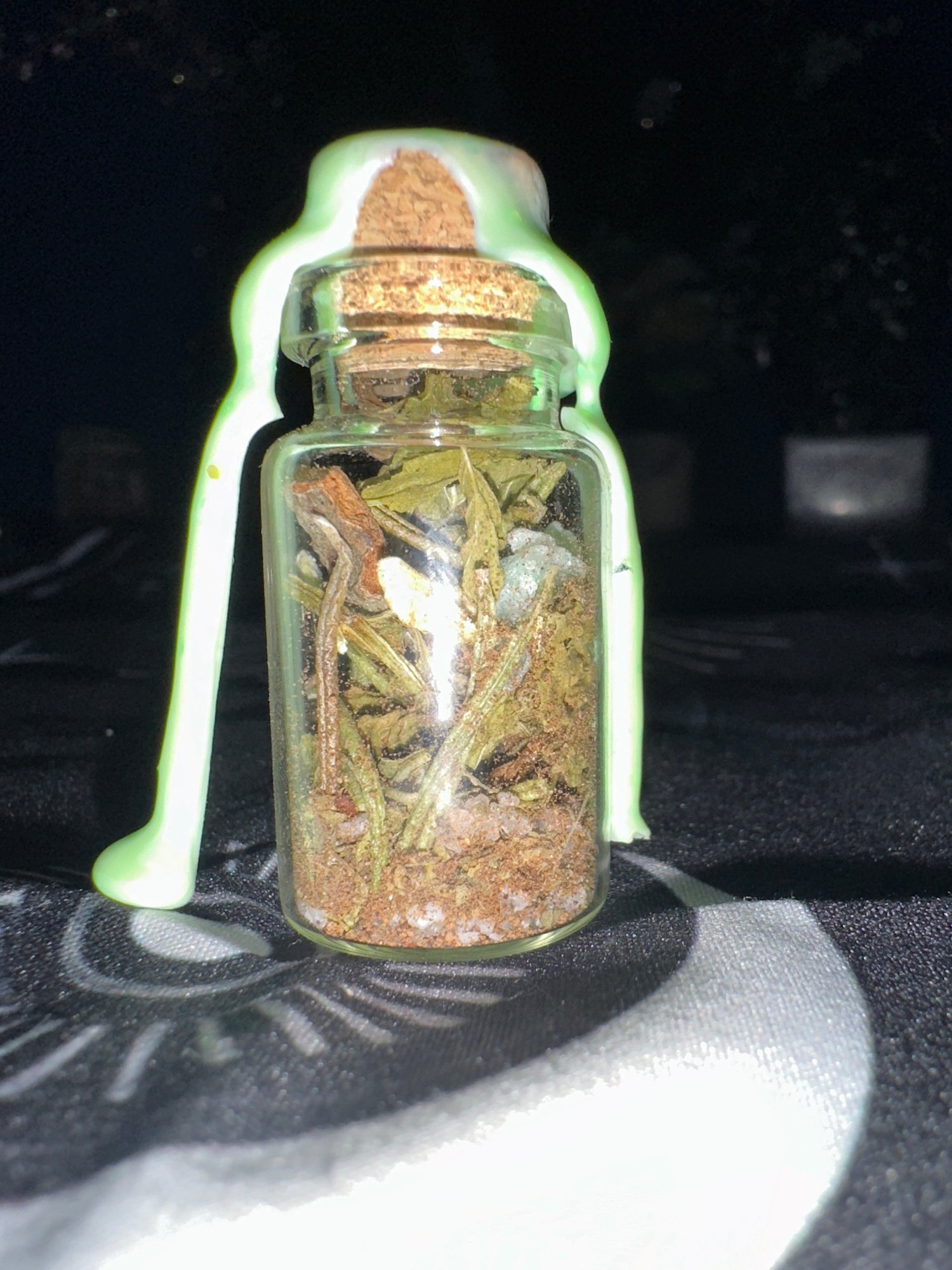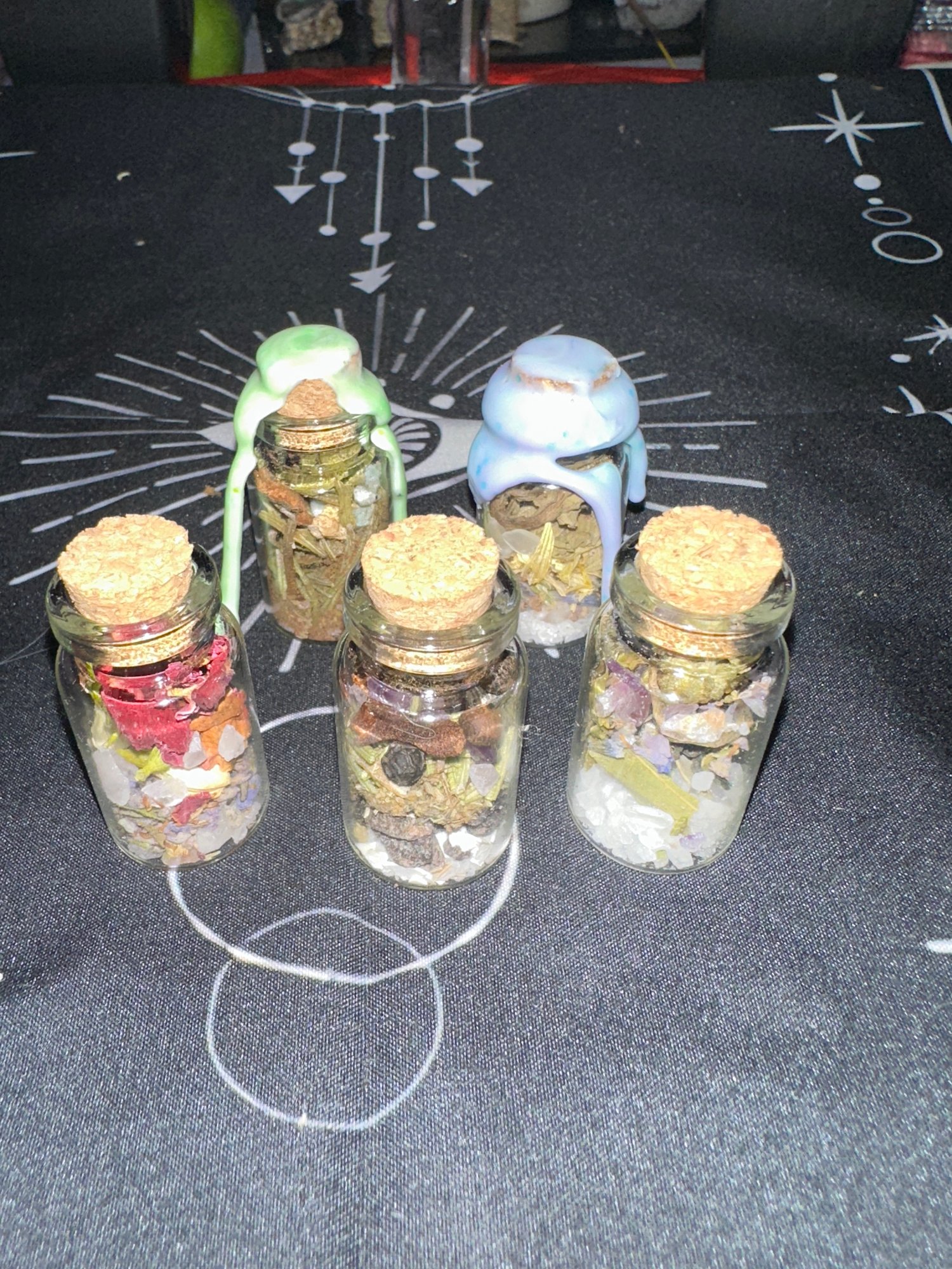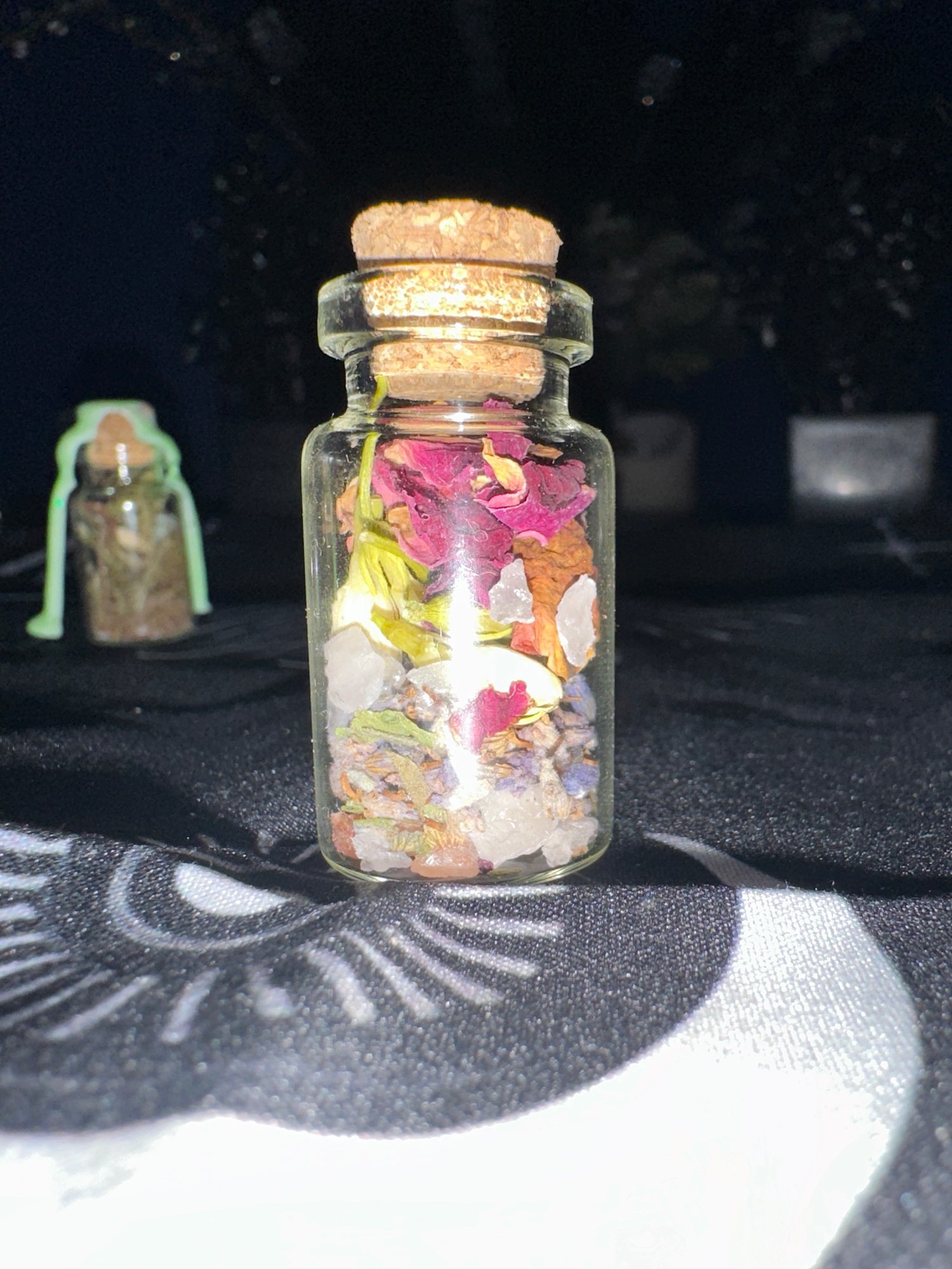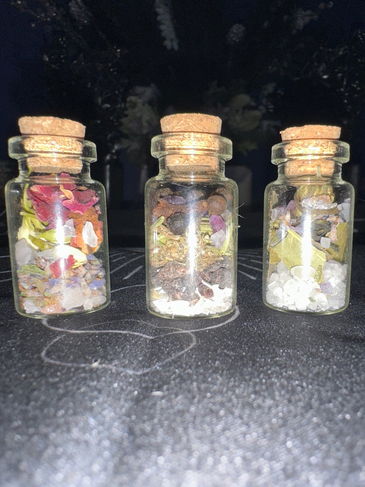 Carry focused magick with you in our Mini Spell Jars, designed as powerful talismans for your chosen intention. These small yet potent jars are handcrafted with specific ingredients that align with energies like love, protection, prosperity, and more. Each jar is sealed with intent and can be worn as a necklace, placed in your car, or carried with you for a discreet charm on the go. Perfect for those seeking a compact, personal touch to their daily practice.