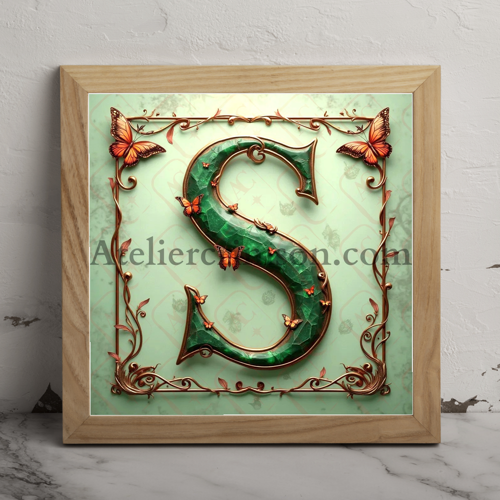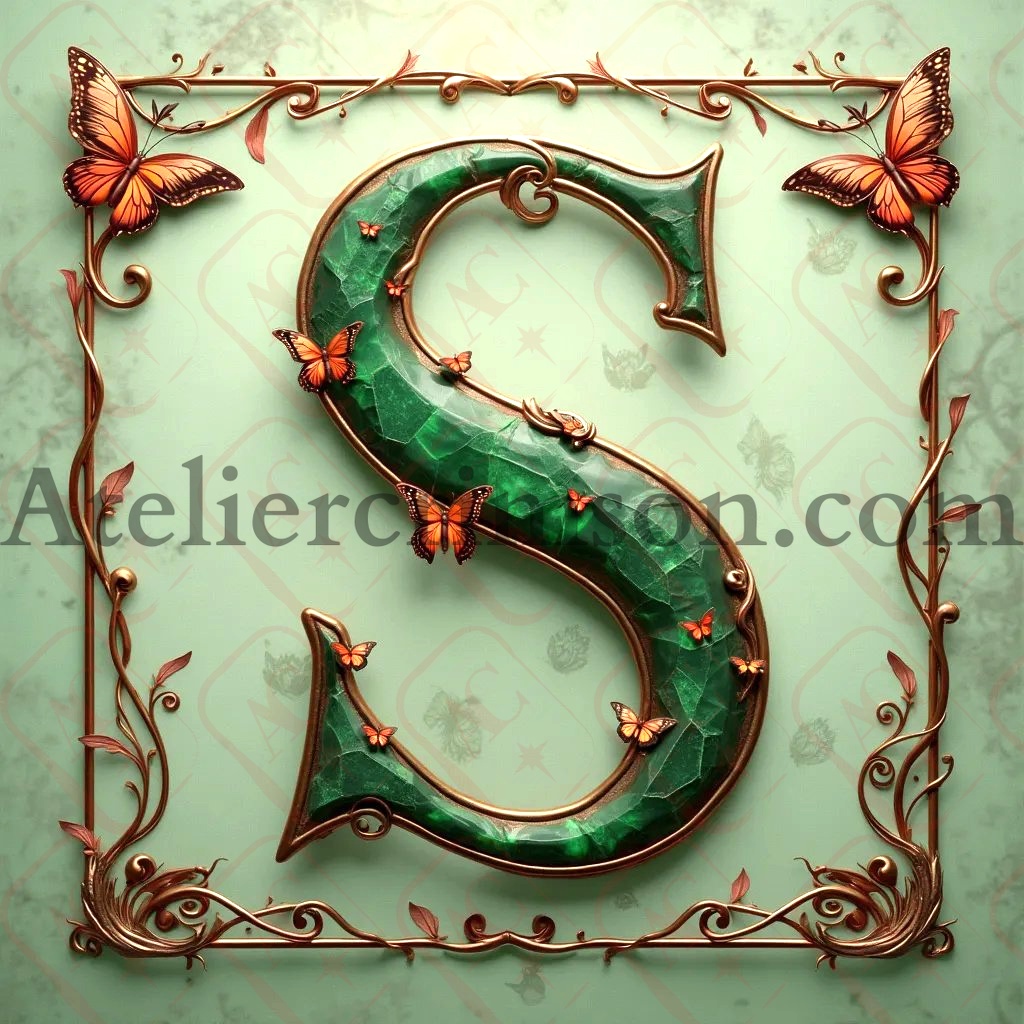 The letter S emerald and copper Art Nouveau Intricate design with floral patterns, butterflies, and vines. Elegant sage green background. Perfect for vintage lovers and typography enthusiasts.