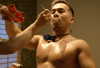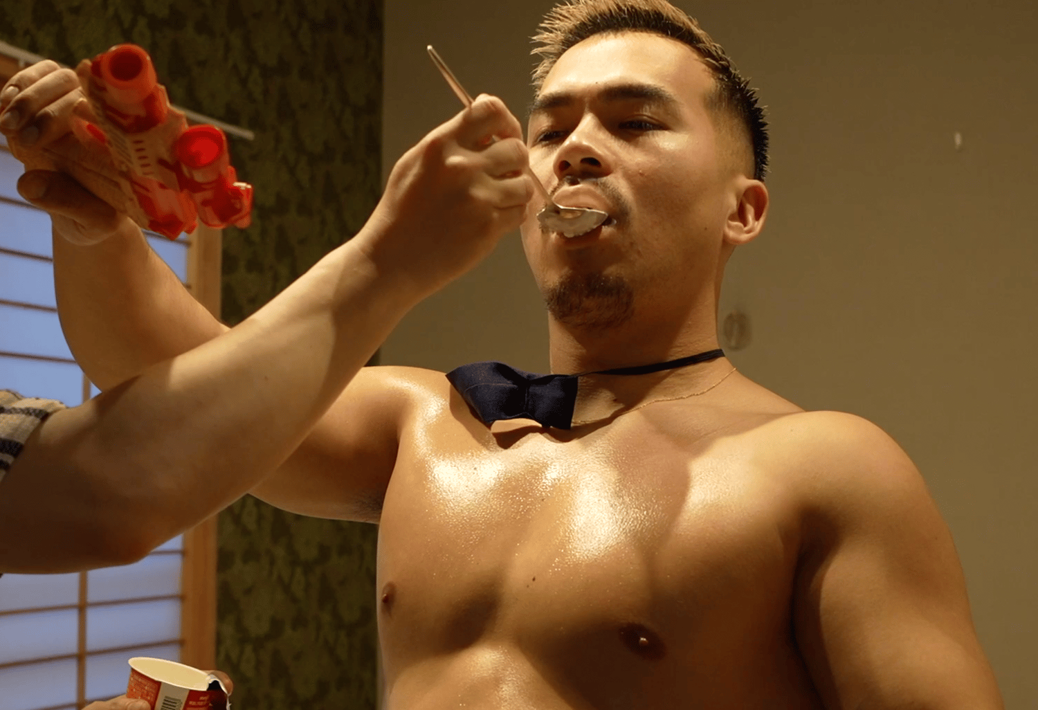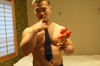 Gota is a Policeman entering an apartment in patrol, when he finds out an intruder and gets frozen stiff. I play with his necktie and tongue, then remove his police uniform and put him on the bed. After he is oiled up and ready in underwear, he gets fed some yogurt and... some goes on his bare feet.