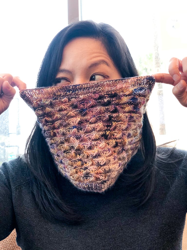 Cream Puff uses double-wrapped stitches which are elongated on the following row to create the puffy texture, great for variegated yarns.