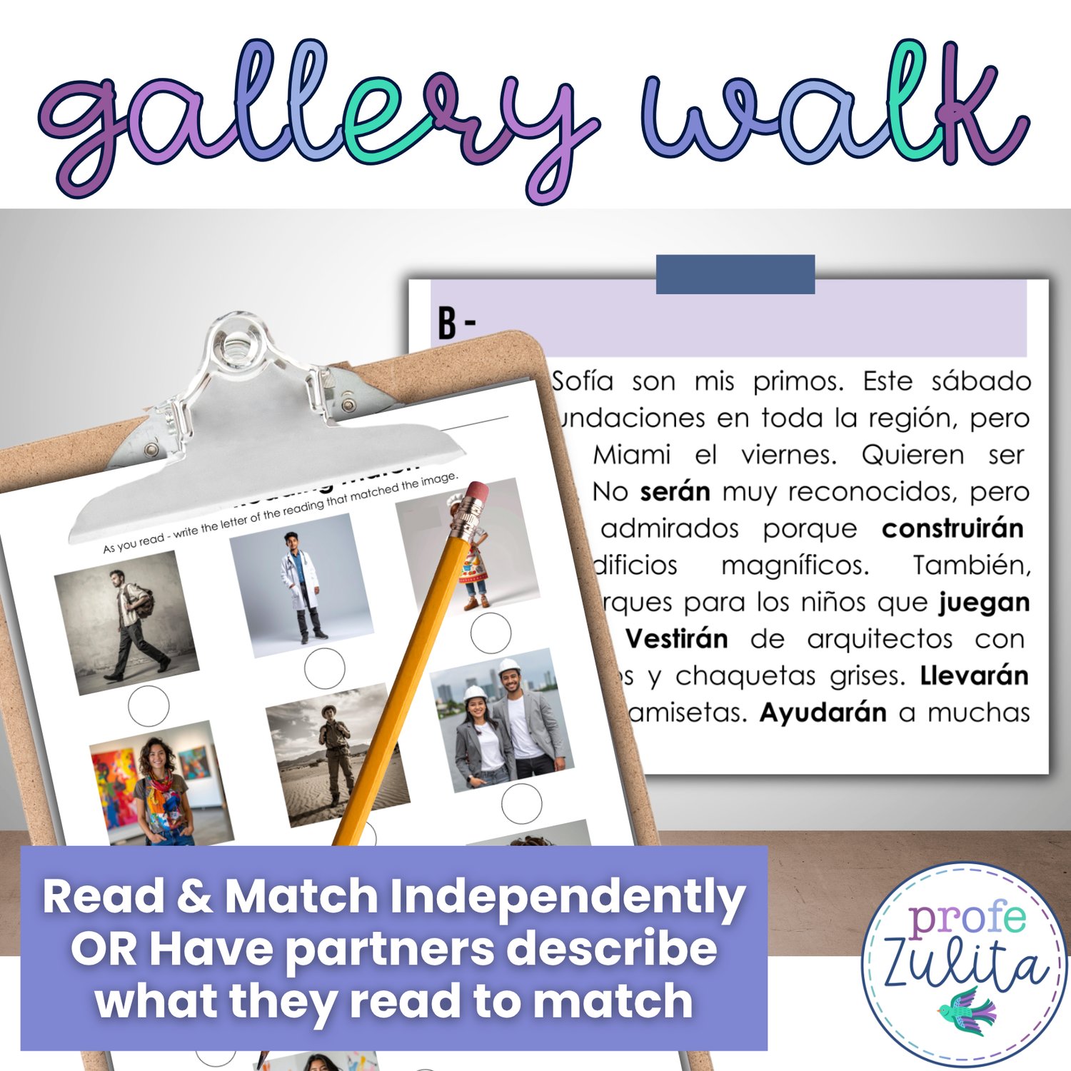 This gallery walk will provide your students with 10 focused readings written to provide structured input with Spanish future tense verbs & structured phrases used with the future in Spanish. Your student will read a set of texts about what someone will do in the future & match them to a picture on their note catcher.