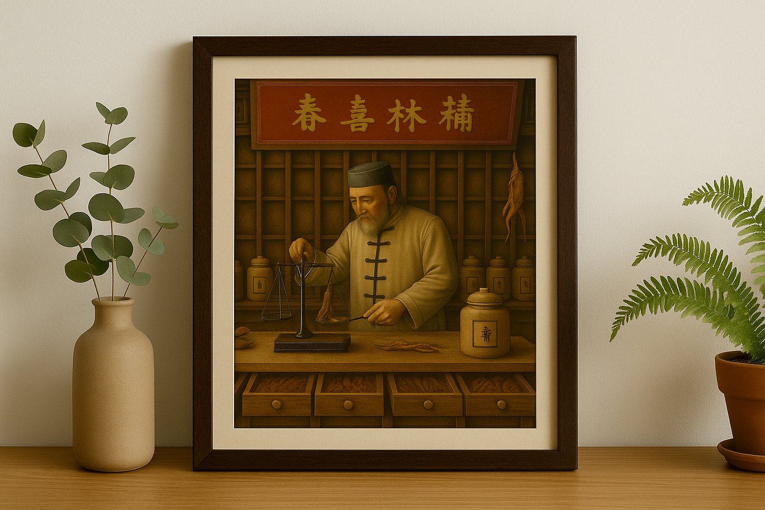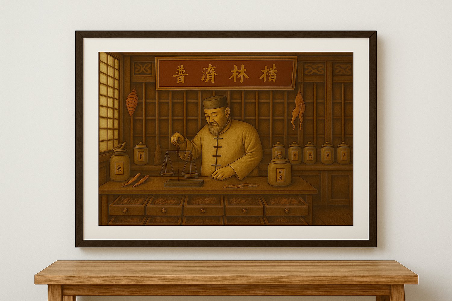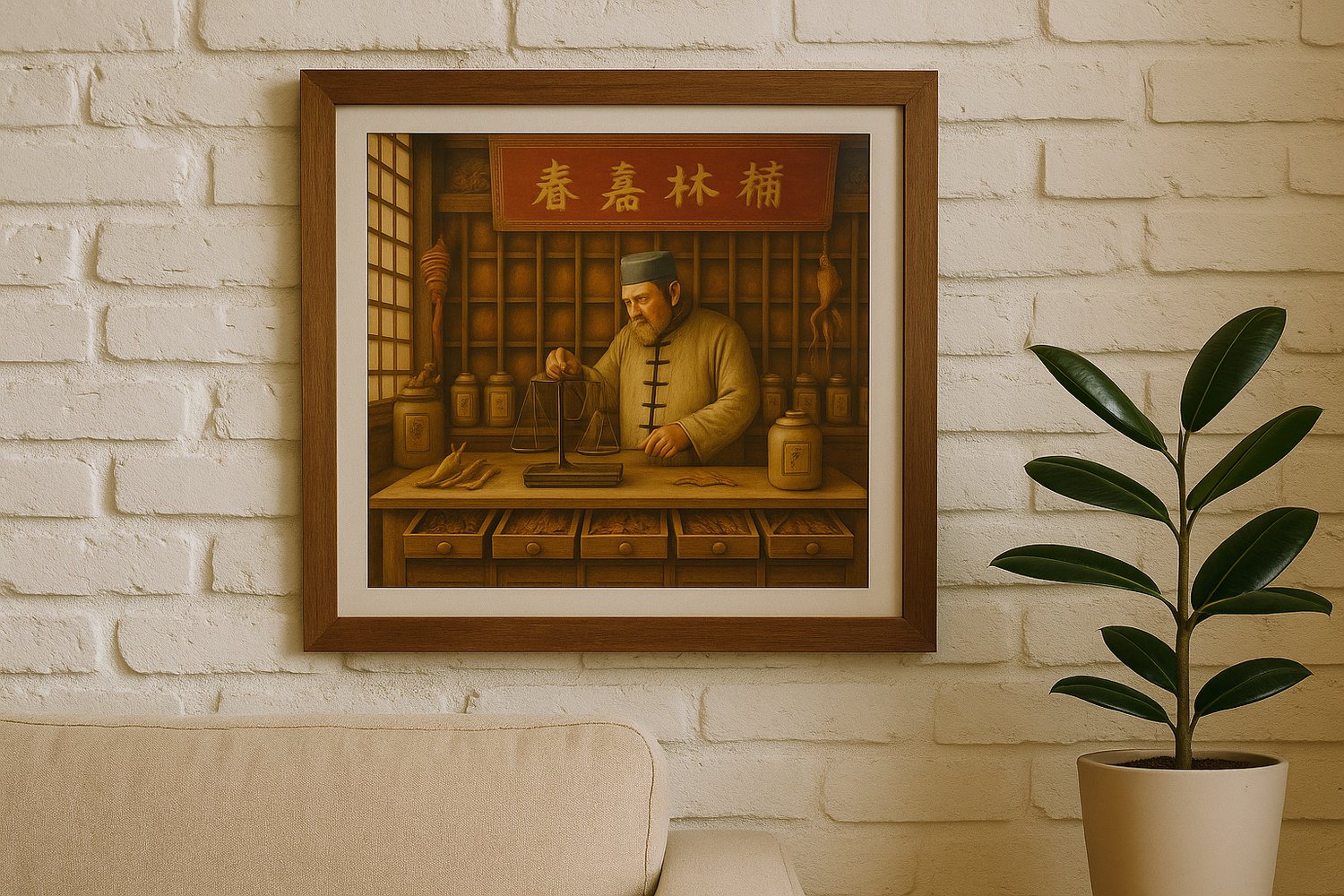 Step into the world of traditional healing with The Medicine Man, a vintage-inspired art print portraying a wise apothecary carefully weighing herbs and remedies. Surrounded by shelves of jars, roots, and tinctures, this evocative artwork captures the essence of Chinese herbal medicine and the timeless role of healers in Southeast Asian communities.