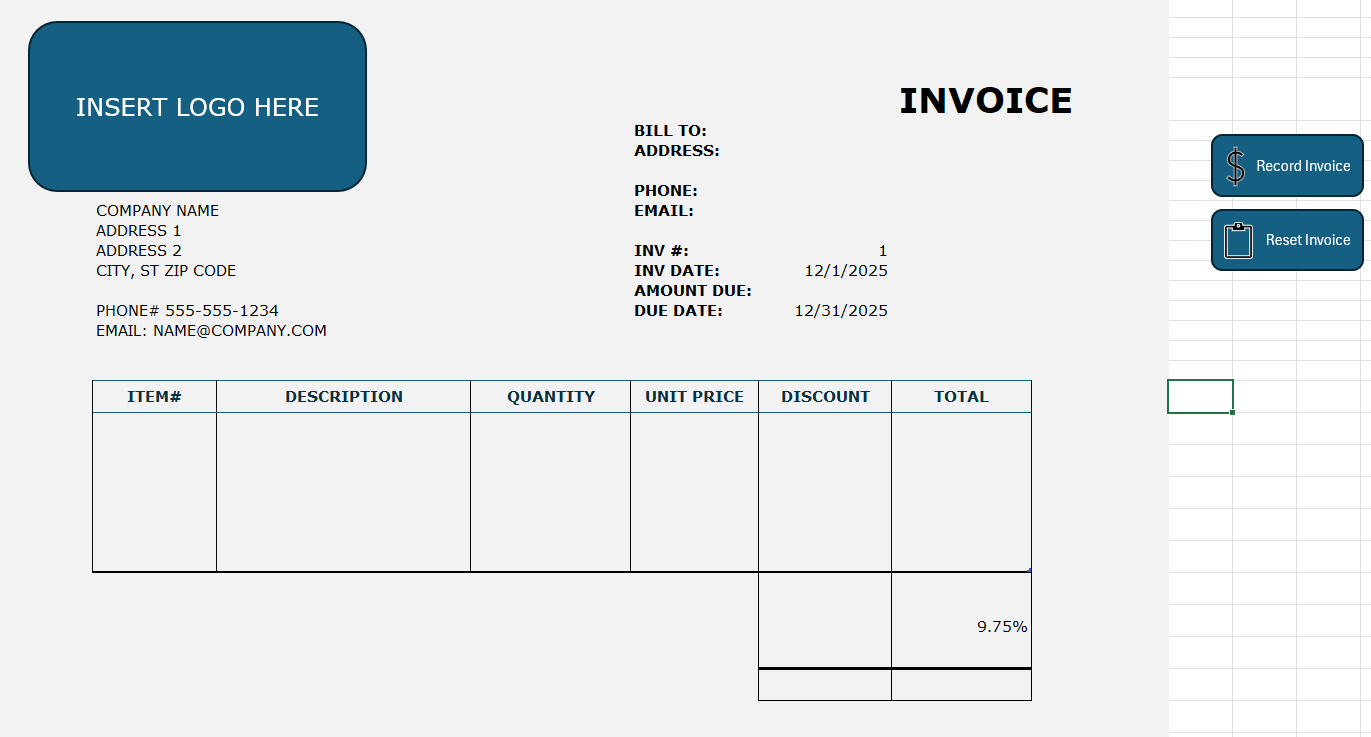 Customize your logo, client info, services, prices, totals, and payment terms.