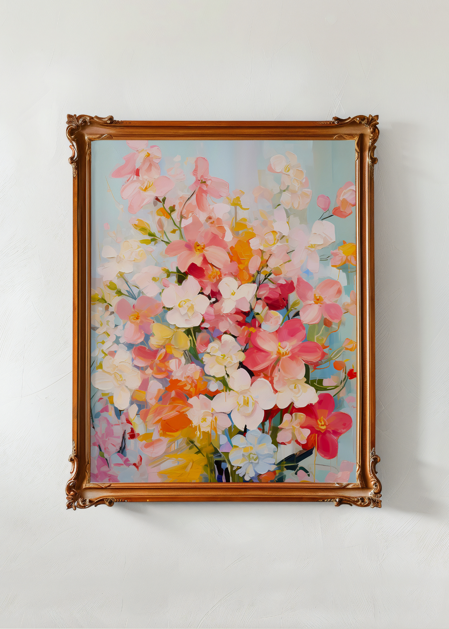 Petal Parade— This joyful explosion of color is like a celebration in bloom. Orchids, daisies, and whimsical petals twist and reach, painting the canvas in shades of fuchsia, apricot, cloud white, and butter yellow. The glassy background adds a dreamy touch, letting each petal and leaf pop with personality. This piece practically sings with life—perfect for any space that craves happiness, warmth, and the wild beauty of a just-picked bouquet.