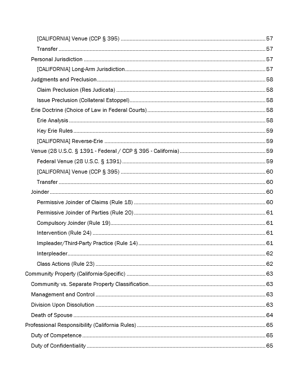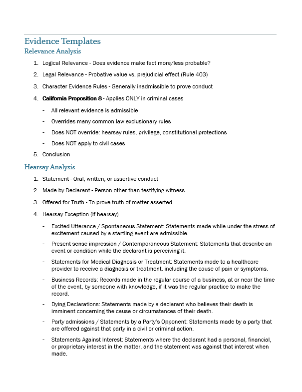 - Complete templates for Contracts, Torts, Criminal Law/Procedure, Real Property, Evidence, Constitutional Law, Civil Procedure, Professional Responsibility, Remedies, Trusts & Wills, Community Property, and Business Associations