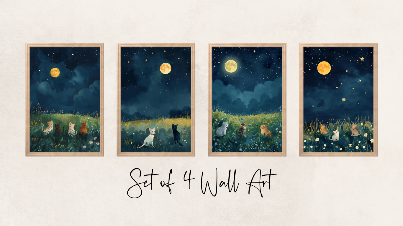 Bring a touch of magic and serenity to your space with this Moonlit Whiskers Wall Art Set - a collection of four coordinating digital prints featuring cats under the night sky. Each artwork captures a quiet moment of wonder, with soft moonlight, glowing stars, and peaceful feline silhouettes, perfect for cat lovers, nature enthusiasts, or anyone who loves calm, dreamy decor. Designed as high-resolution digital downloads, you can print them together as a full set or display individually for a gentle, enchanting touch in any room.
