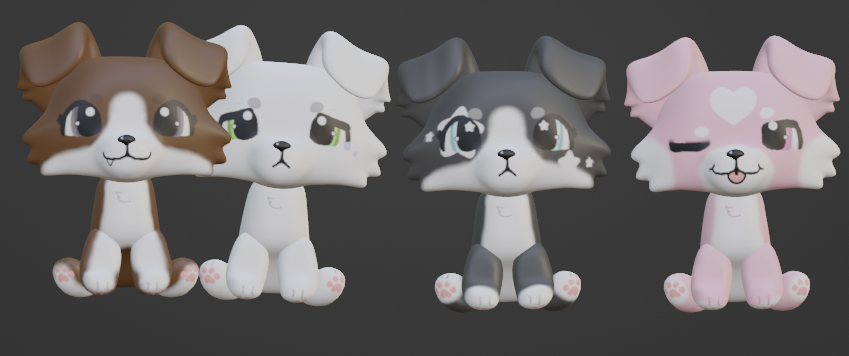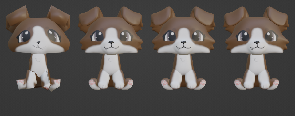 textures of different fur colors, 4 different dogs for optimizations, down from high poly to the lowest