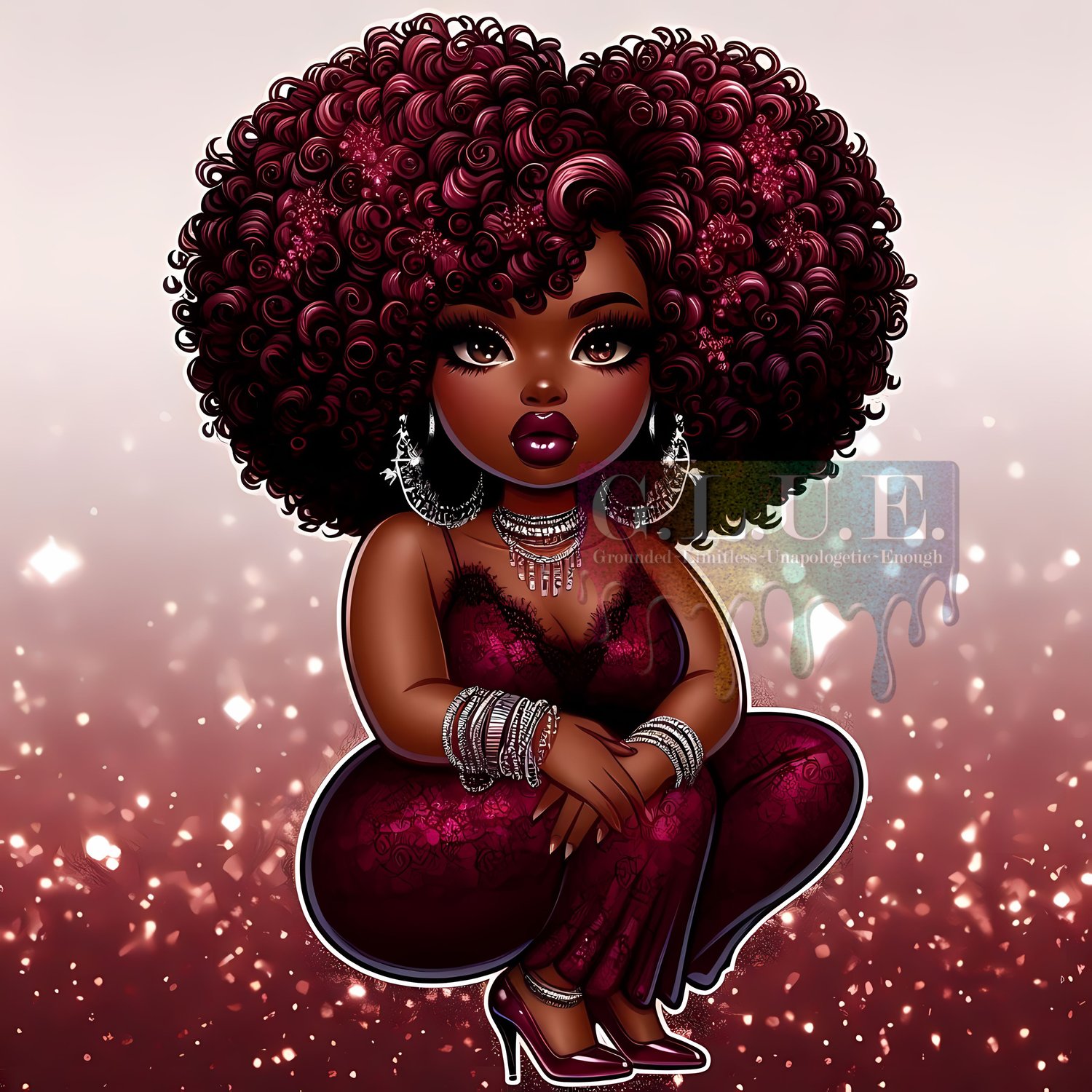 Bring elegance and confidence to your designs with this Burgundy Glam Afro Black Woman PNG — a high-resolution digital illustration featuring a stunning Black woman with a voluminous burgundy afro, deep wine-colored lace outfit, sparkling jewelry, and matching stiletto heels. Her poised seated pose and luxurious accessories make this design perfect for projects that celebrate beauty, empowerment, and style.