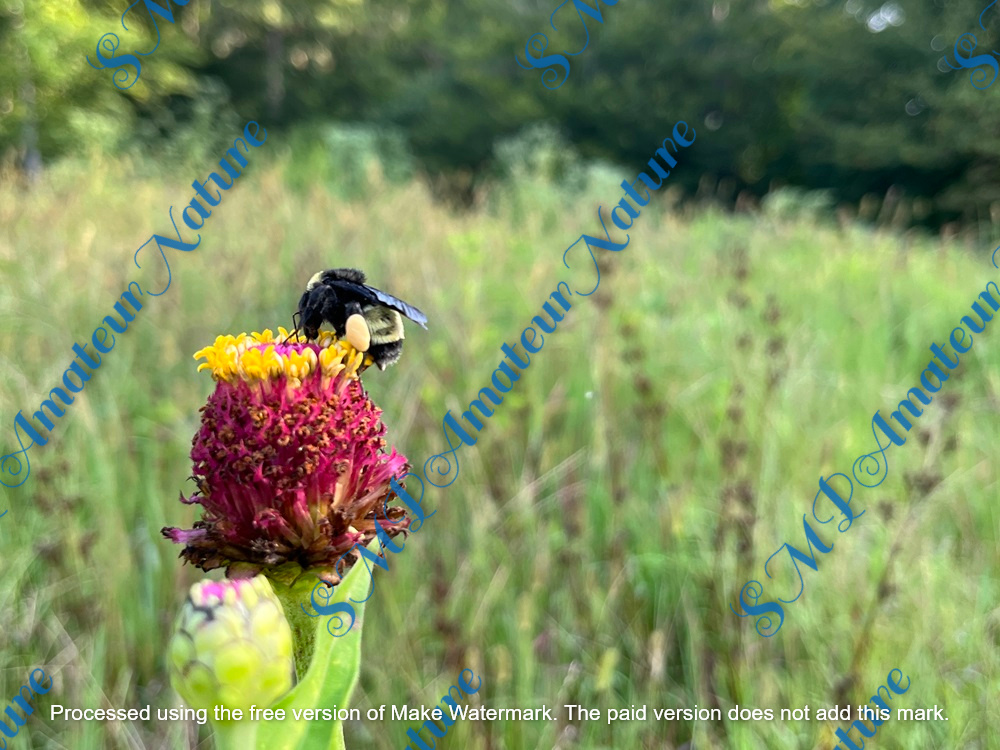 Amateur photograph of an American Bumblebee (Bombus pensylvanicus) foraging on a flower in front of a meadow. Image taken in Virginia, USA. Image pixels 3024x4032. Image easily resized as required for buyer needs. Purchase gives image without any watermark.