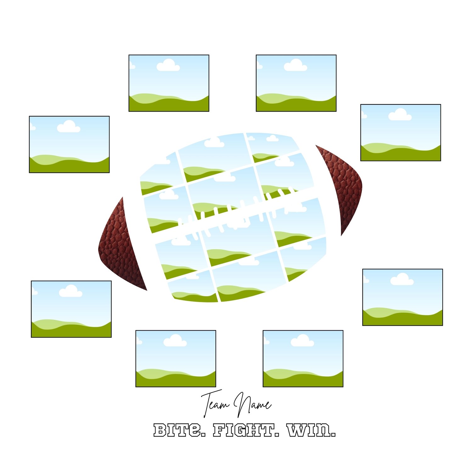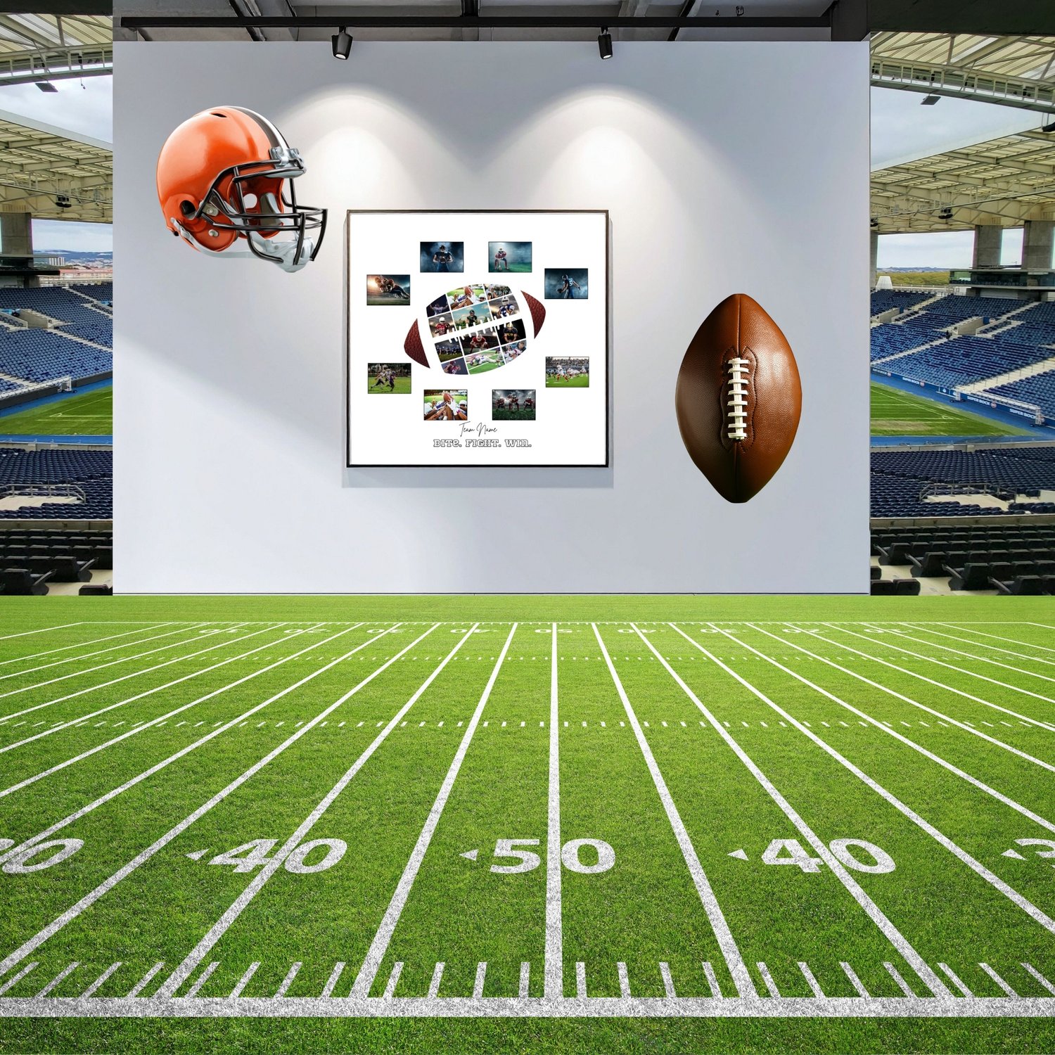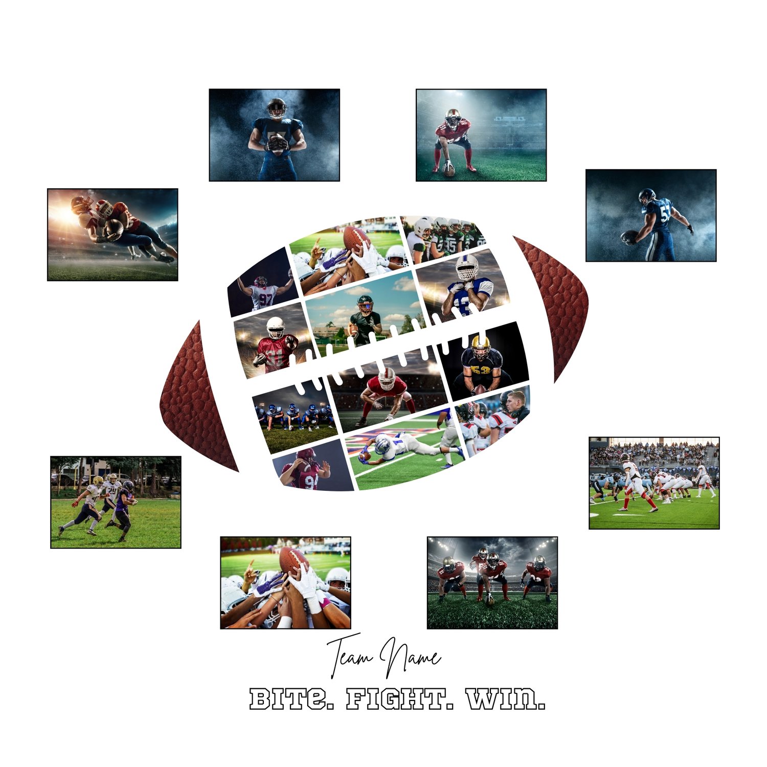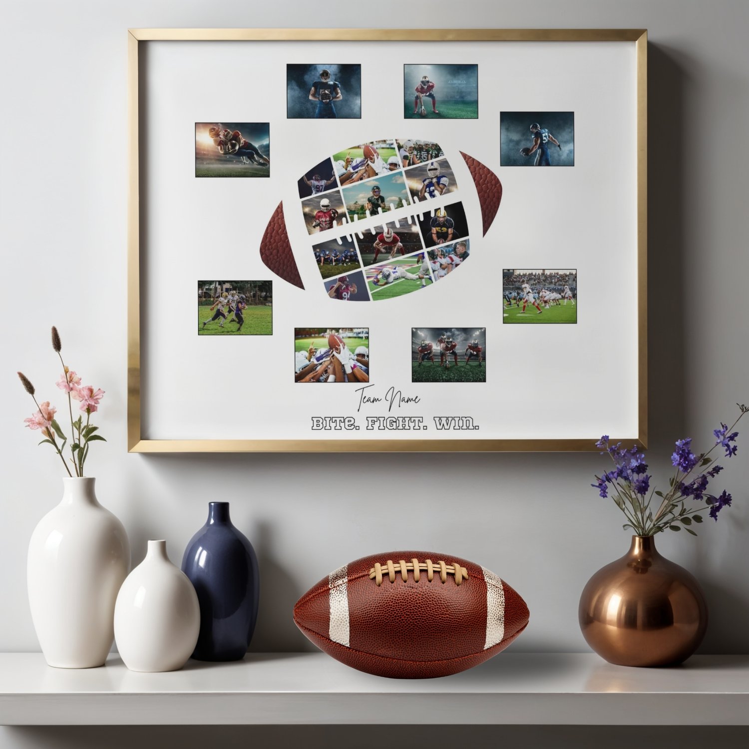 * Custom Football Shape: Distinctive central collage frame designed for impact.