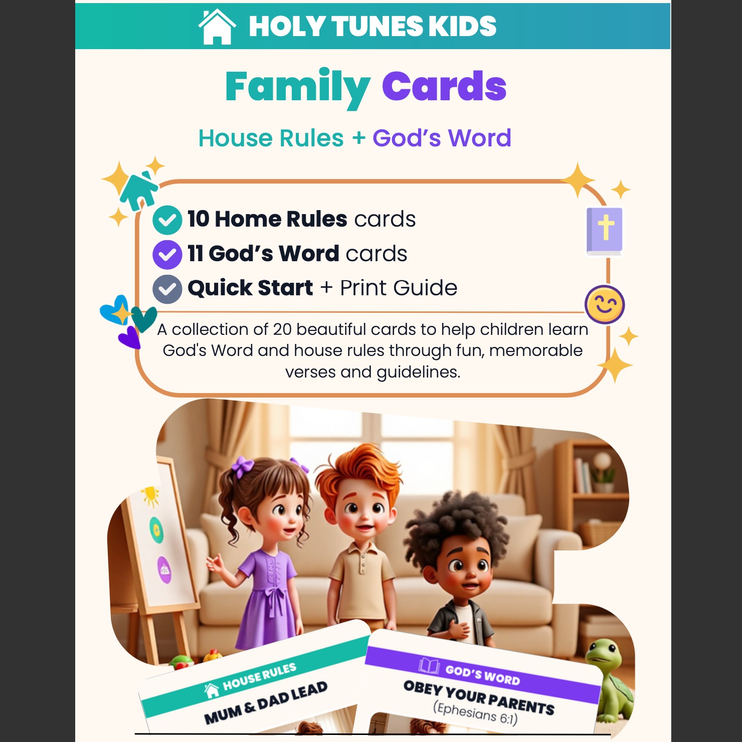 - 20 family cards: House Rules + God’s Word (short, memorable, kid-friendly).