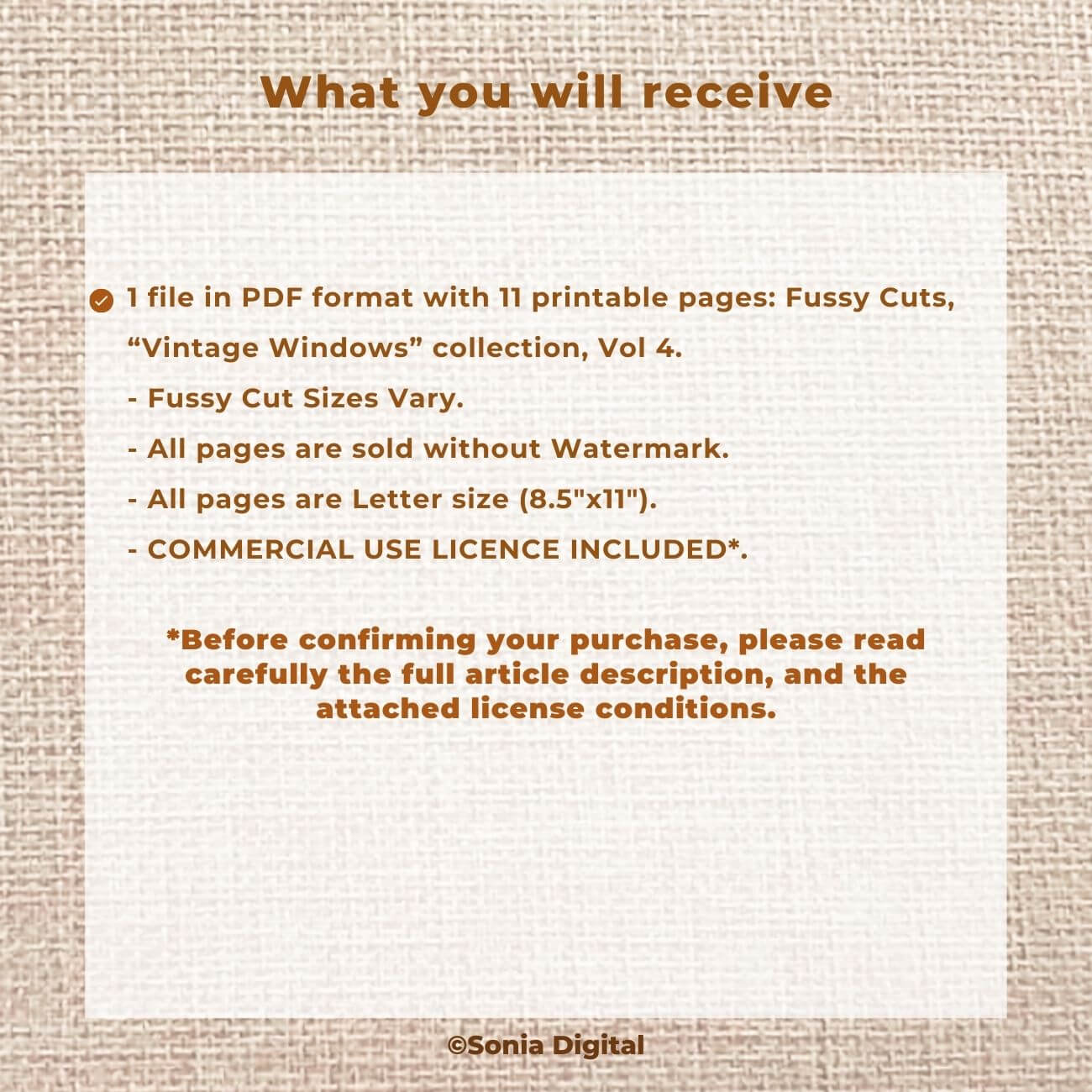 🔸11 printable pages containing Fussy Cuts, “Vintage Windows” Collection (Vol 4). In Letter size, 8.5”x11”. All pages are sold watermark-free. Fussy Cut Sizes vary. Commercial use license included*.