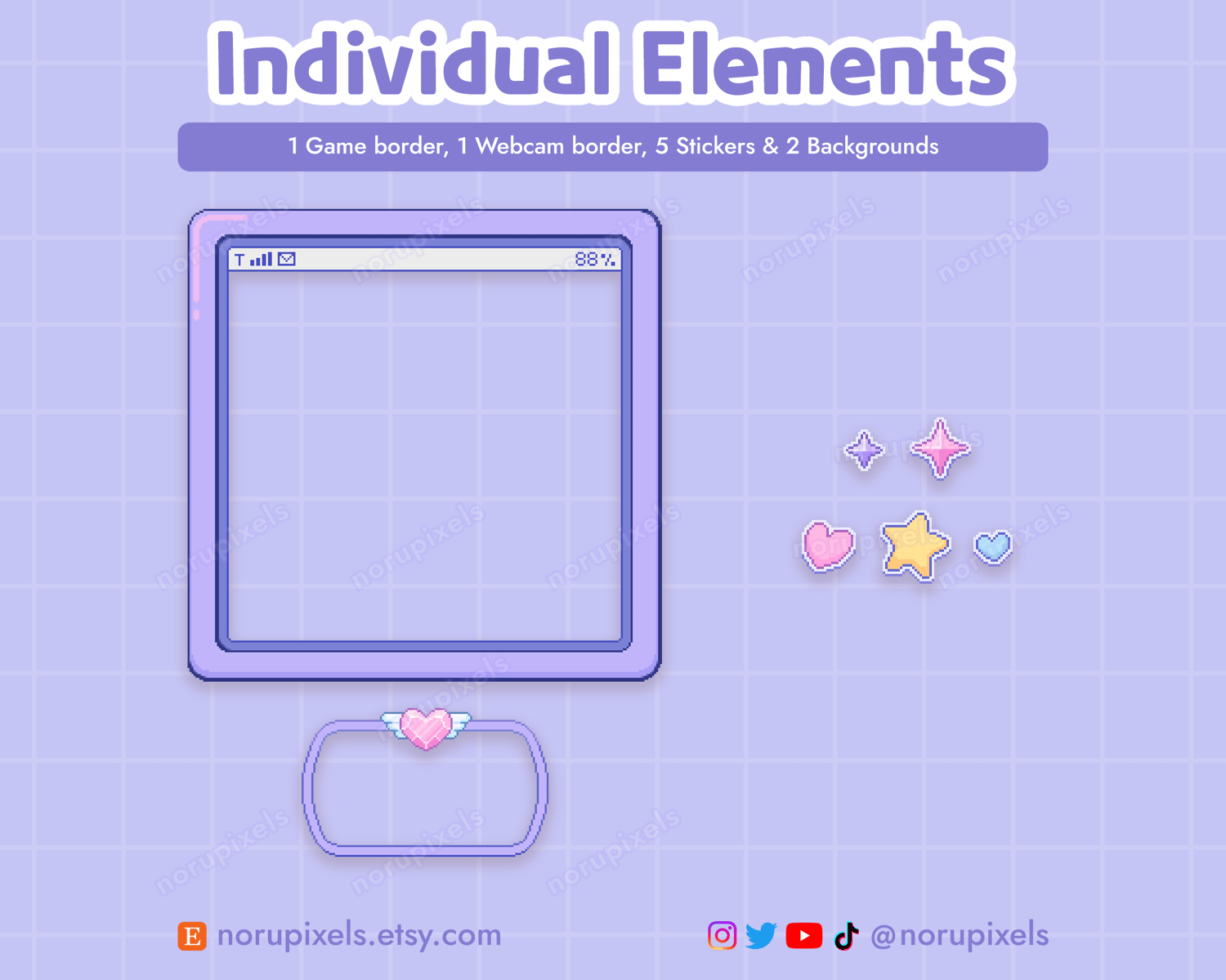 - Individual elements from overlay: 1 game border, 1 webcam border, 5 stickers & 2 backgrounds (.PNG format)