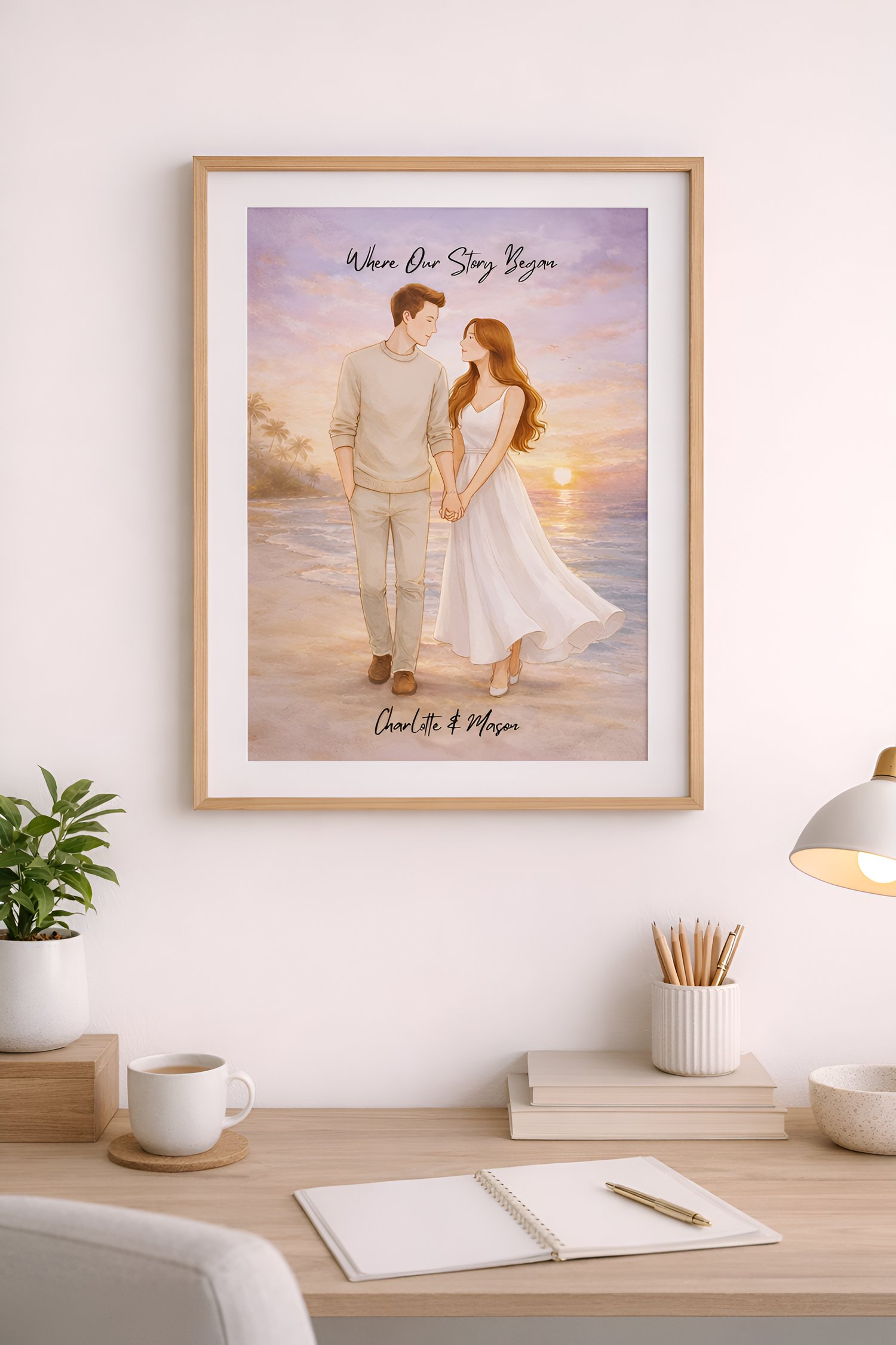 This romantic watercolor artwork captures a couple walking along the shore — symbolizing the place where your story began. Perfect for anniversaries, weddings, engagements, or as a meaningful gift for your partner.