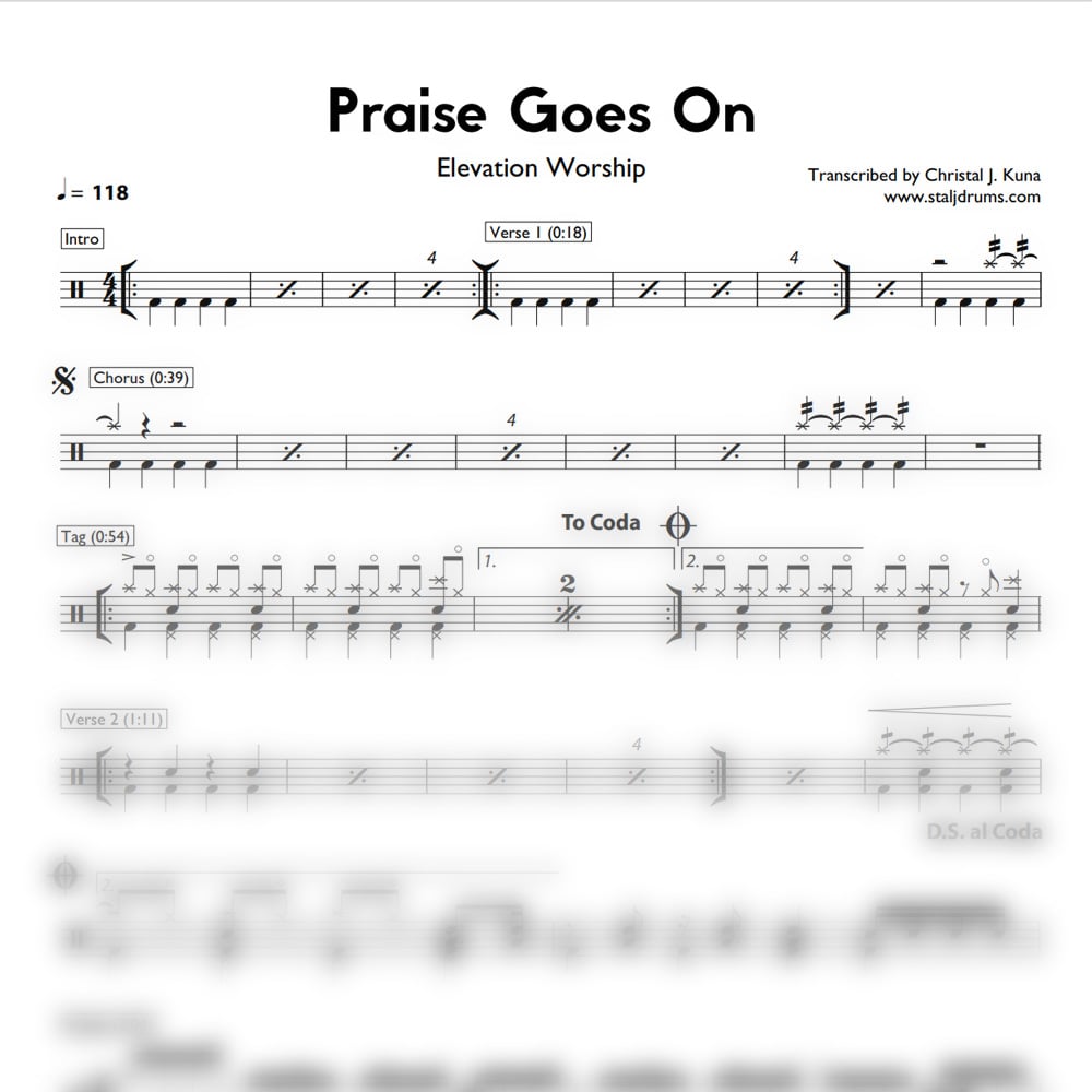 Drum sheet music for Praise Goes On by Elevation Worship, formatted by section and with timestamps.