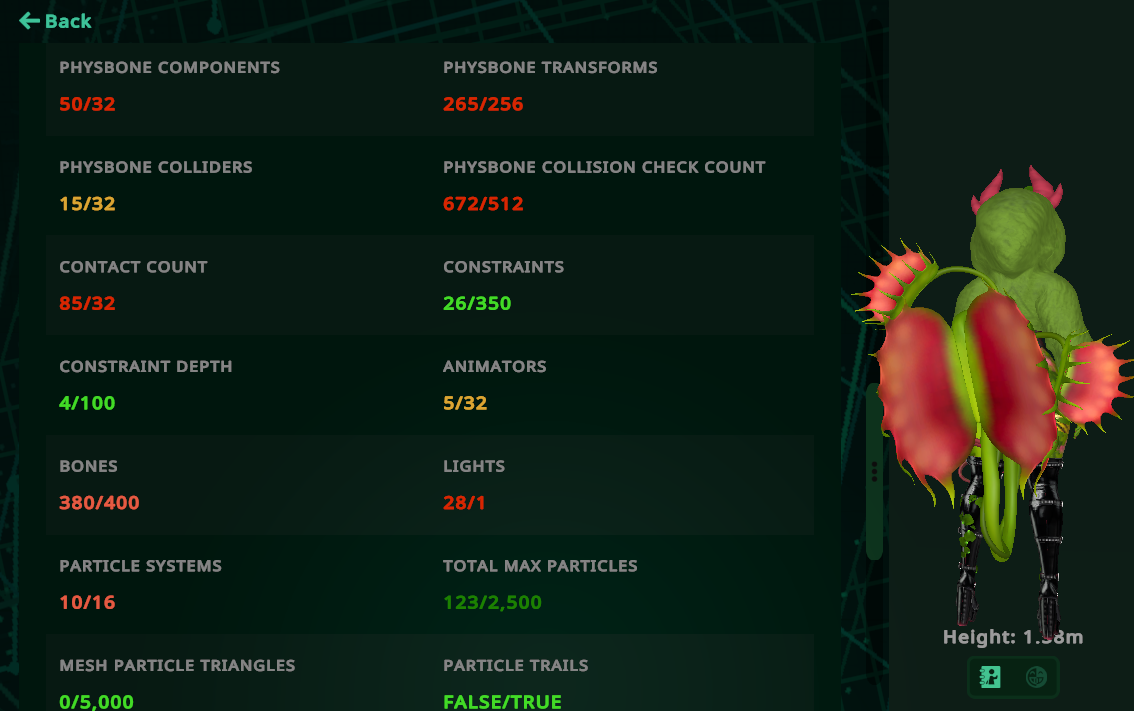 Head - Base body - Body/Face texture - Body Tattoos - Blood - Jacket - Bodysuit - Heels - Hair Long - Ponytail - Hair short - Leaf ears - Leaf Head - Flower crown - Chocker - Snek - Body Leaves - Flytraps - Monster Tail - Elf ears - Mask - Teeth - Forest WorldDrop - Fly Follower - Flow toy - Follower system - Plush System - Locomotion - Index Gesture - VRCLabs - WFT - Gesture Menu - SPS+Lolipop