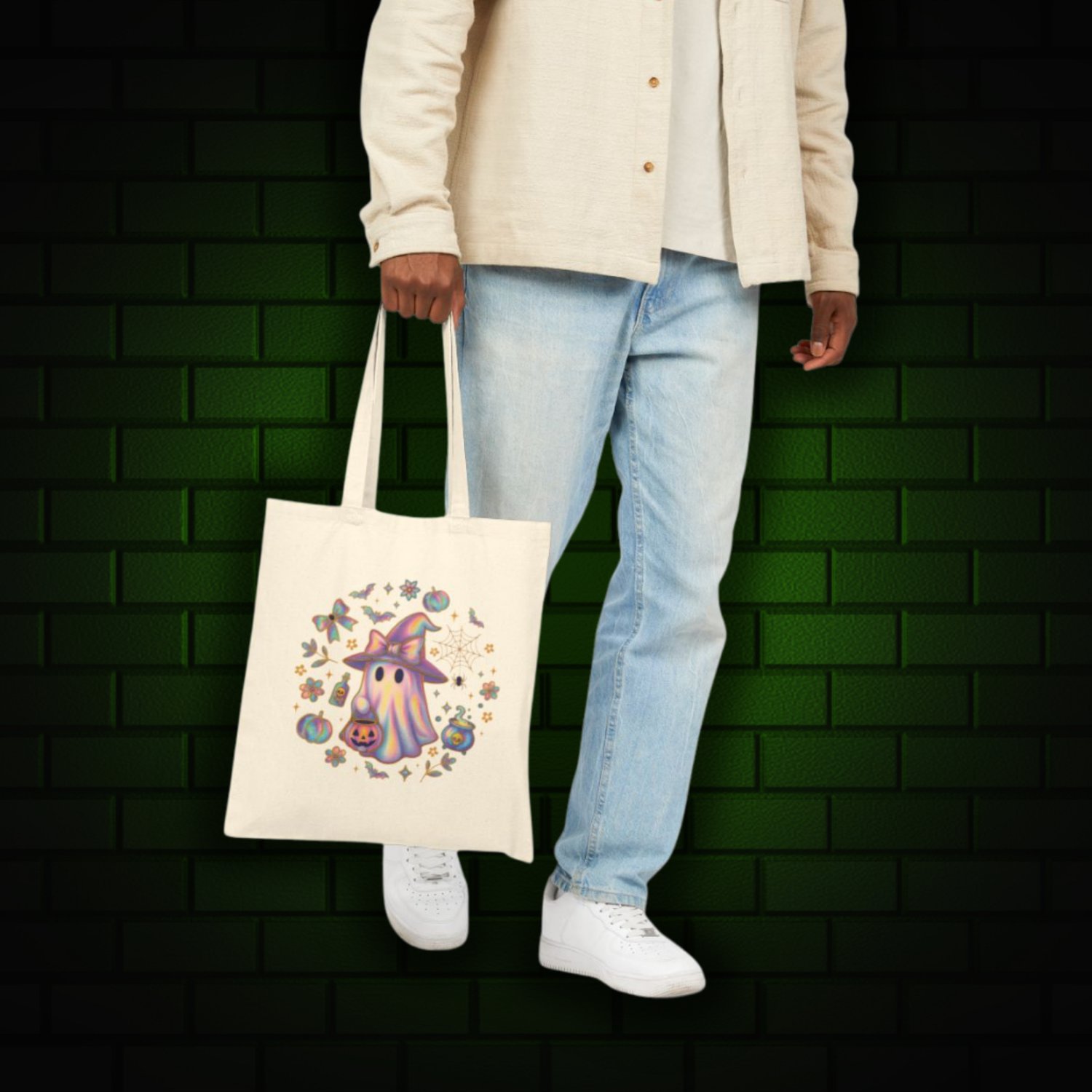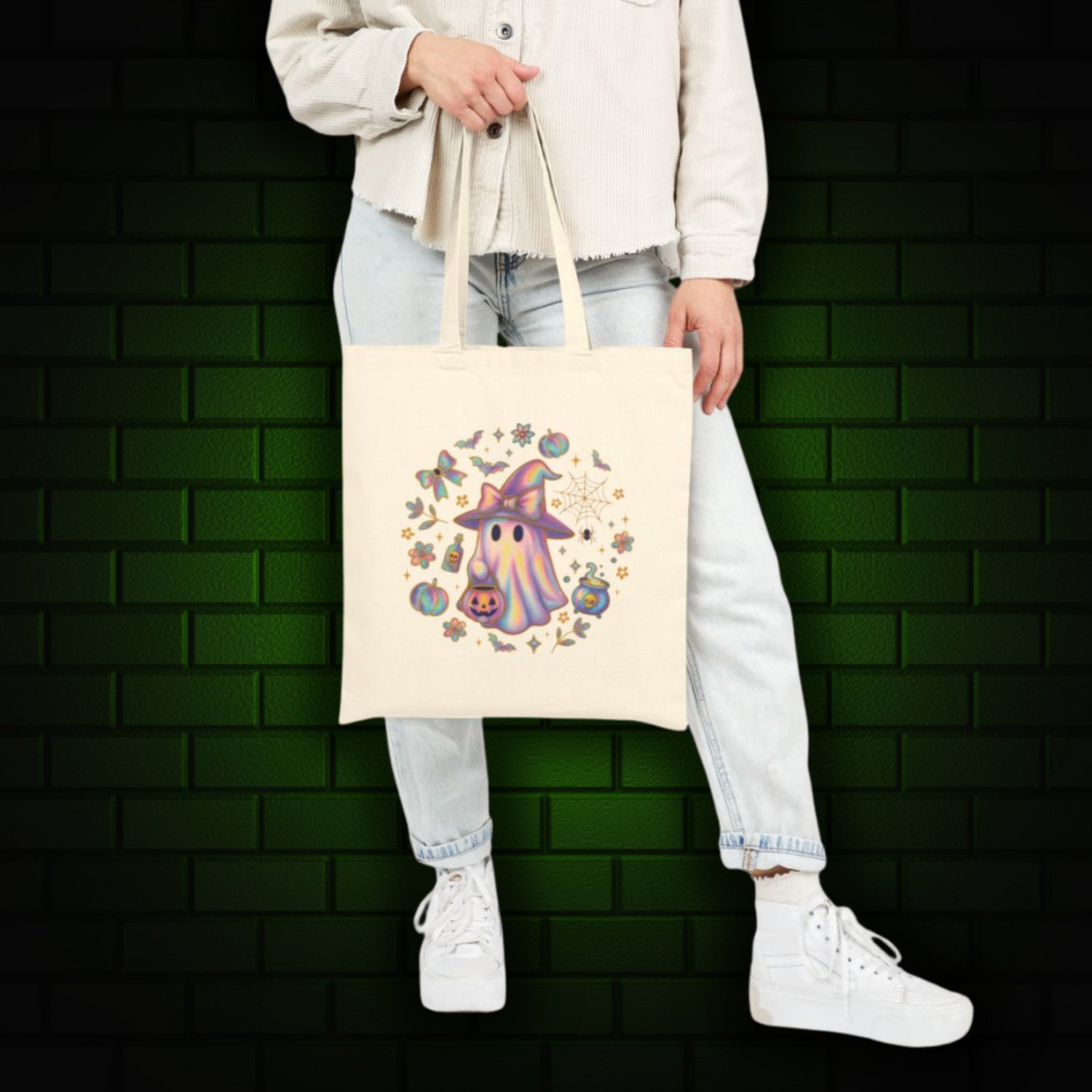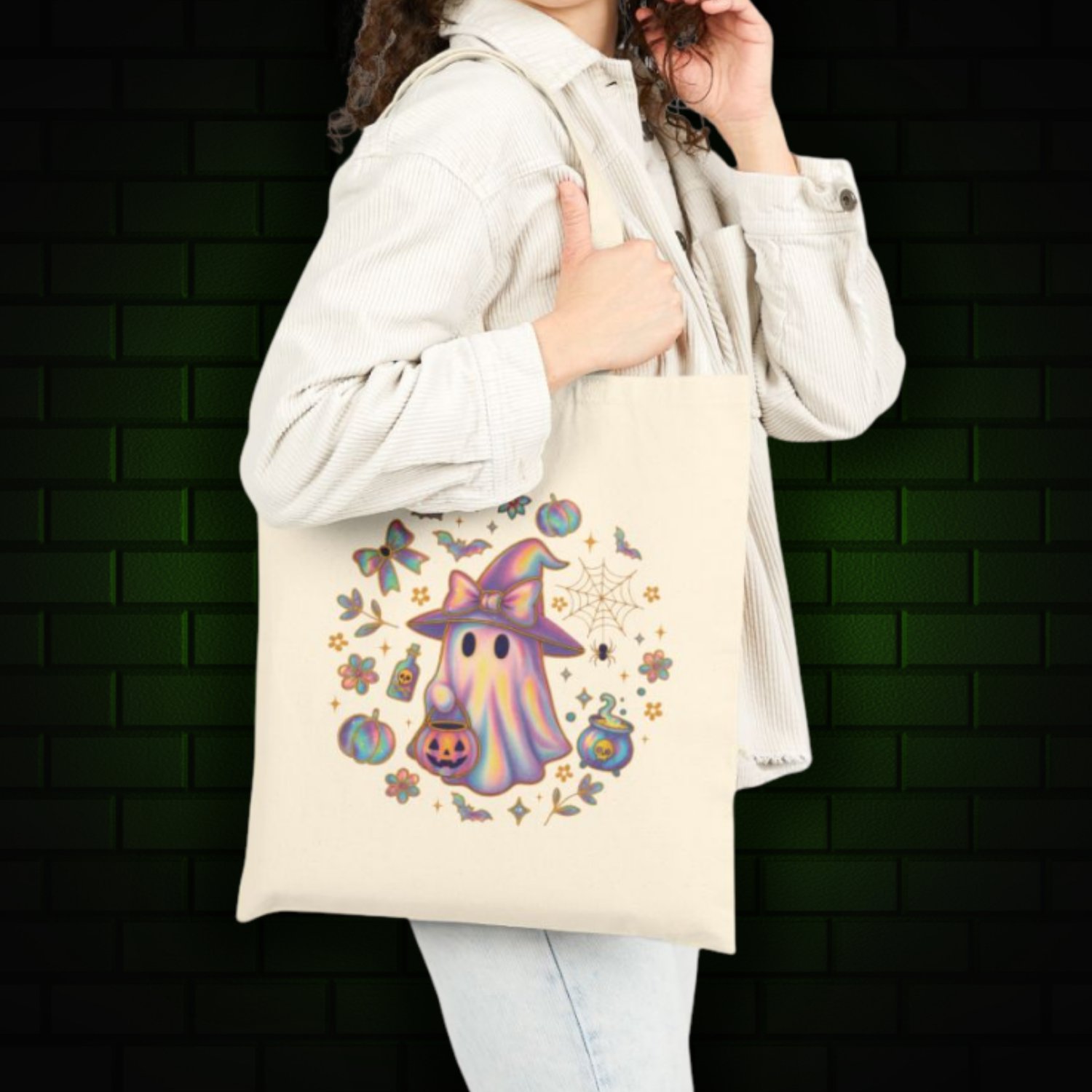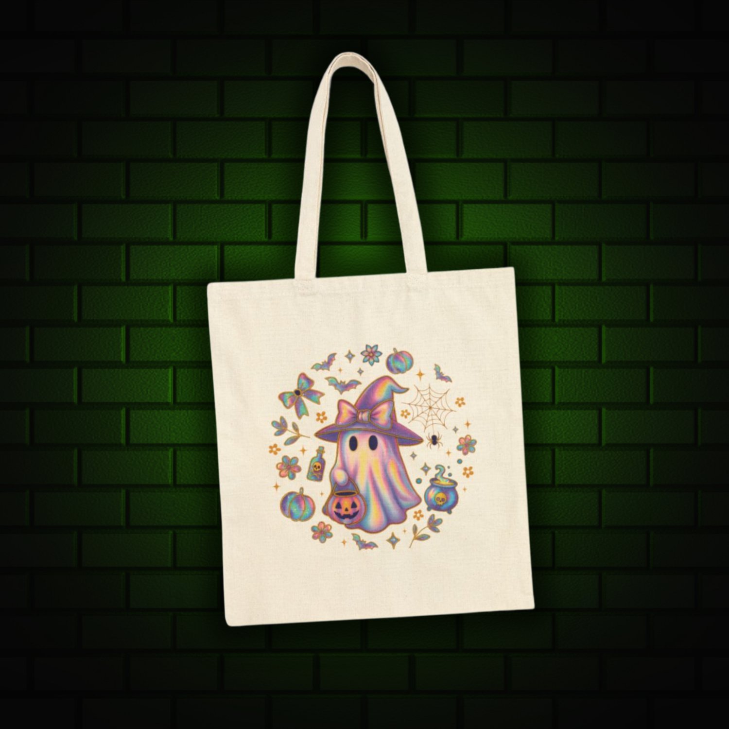 Iridescent Witch & Ghost Circle Tote Bag – Spooky Cute Halloween Shopper, Pastel Gothic Trick-or-Treat Bag, Creepy-Cute Witchy Tote