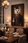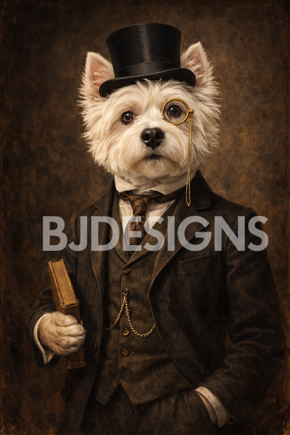 This Victorian-inspired West Highland Terrier portrait captures timeless elegance with a playful twist. Dressed in a classic 19th-century suit, complete with top hat, monocle, waistcoat, and pocket watch chain, this charming gentleman exudes sophistication against a rich antique backdrop.