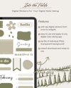 Introducing our first collection of digital stickers, Into the Fields, adding a little nostalgia and charm to your digital planning journey. Each sticker is crafted with care, bringing a touch of good luck to your new wonderful moments. From the classic icons and widgets, our stickers seamlessly blend classic nostalgia with modern flair. Embrace the classic charm of our digital stickers - your everyday expressions just got a whole lot charmer.