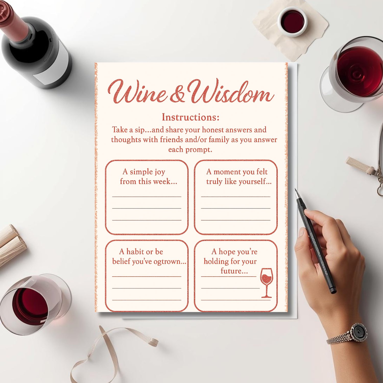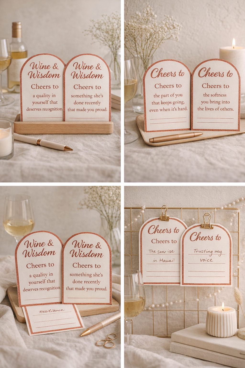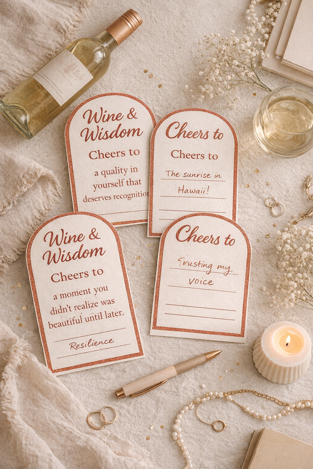 The Wine & Wisdom Printable Game Bundle is a thoughtfully designed collection of reflective prompts and blank Cheers cards created to spark meaningful conversations during wine nights, girls’ nights, retreats, birthdays, and cozy gatherings at home.