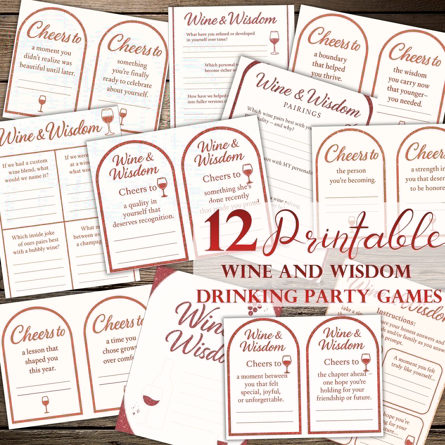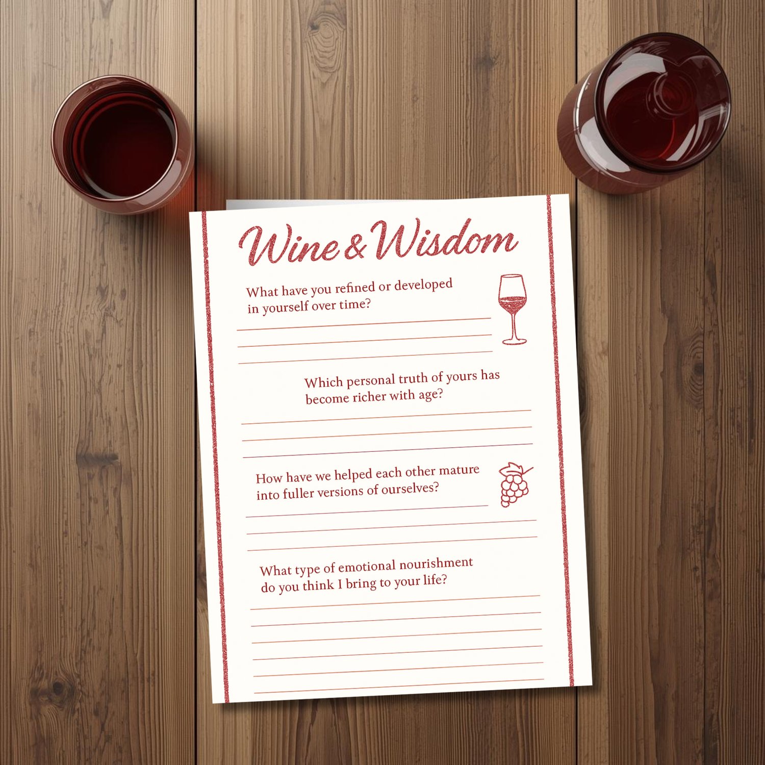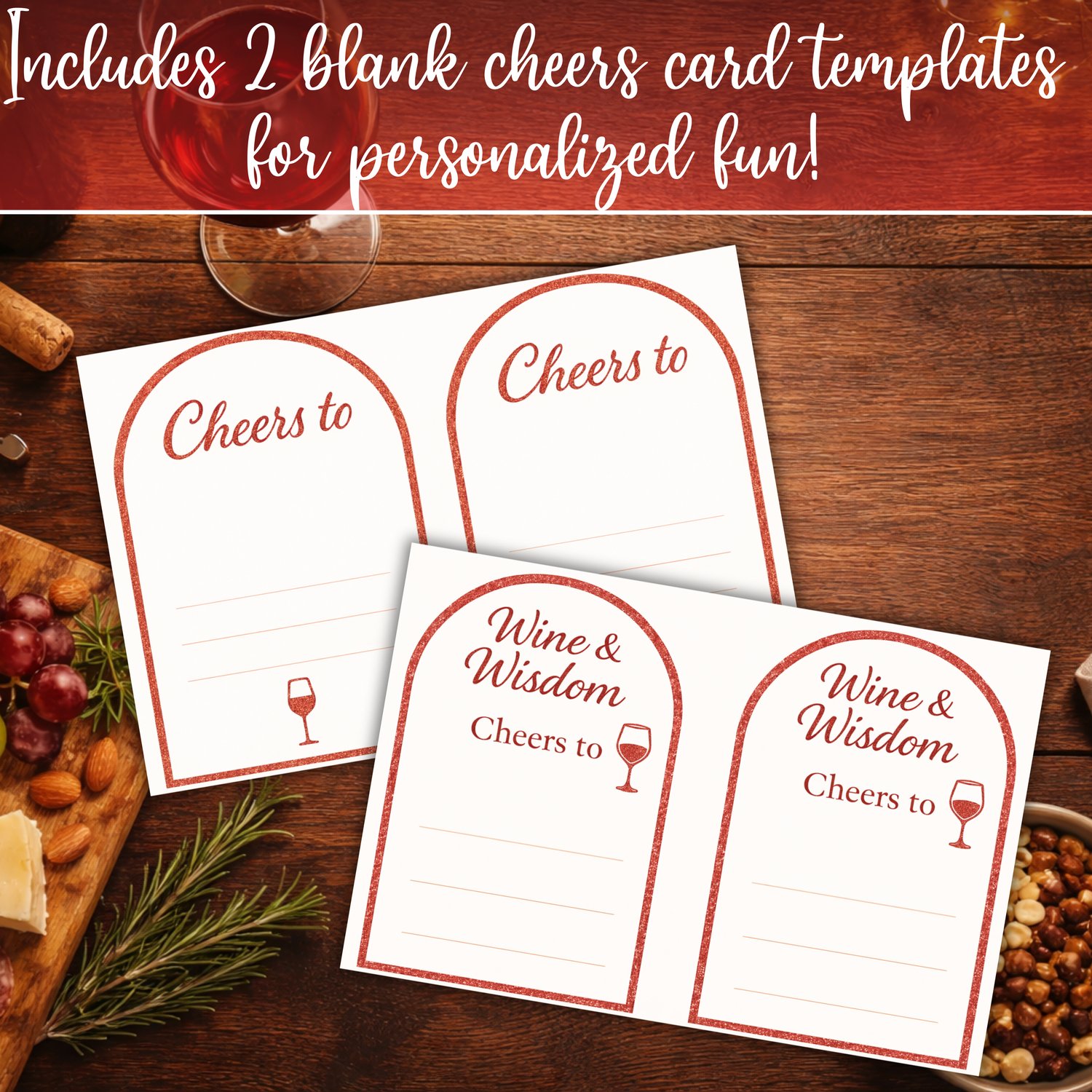 The Wine & Wisdom Printable Game Bundle is a thoughtfully designed collection of reflective prompts and blank Cheers cards created to spark meaningful conversations during wine nights, girls’ nights, retreats, birthdays, and cozy gatherings at home.