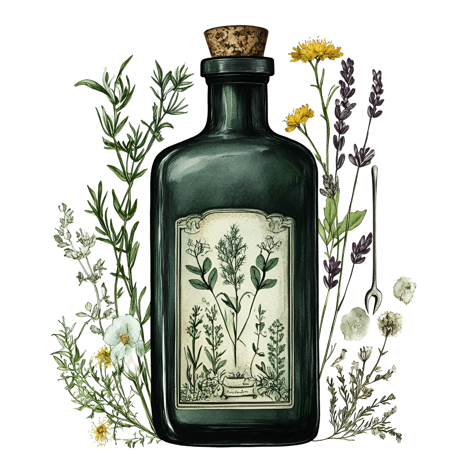 The label displays detailed botanical drawings, evoking the feeling of an old healer’s notebook.