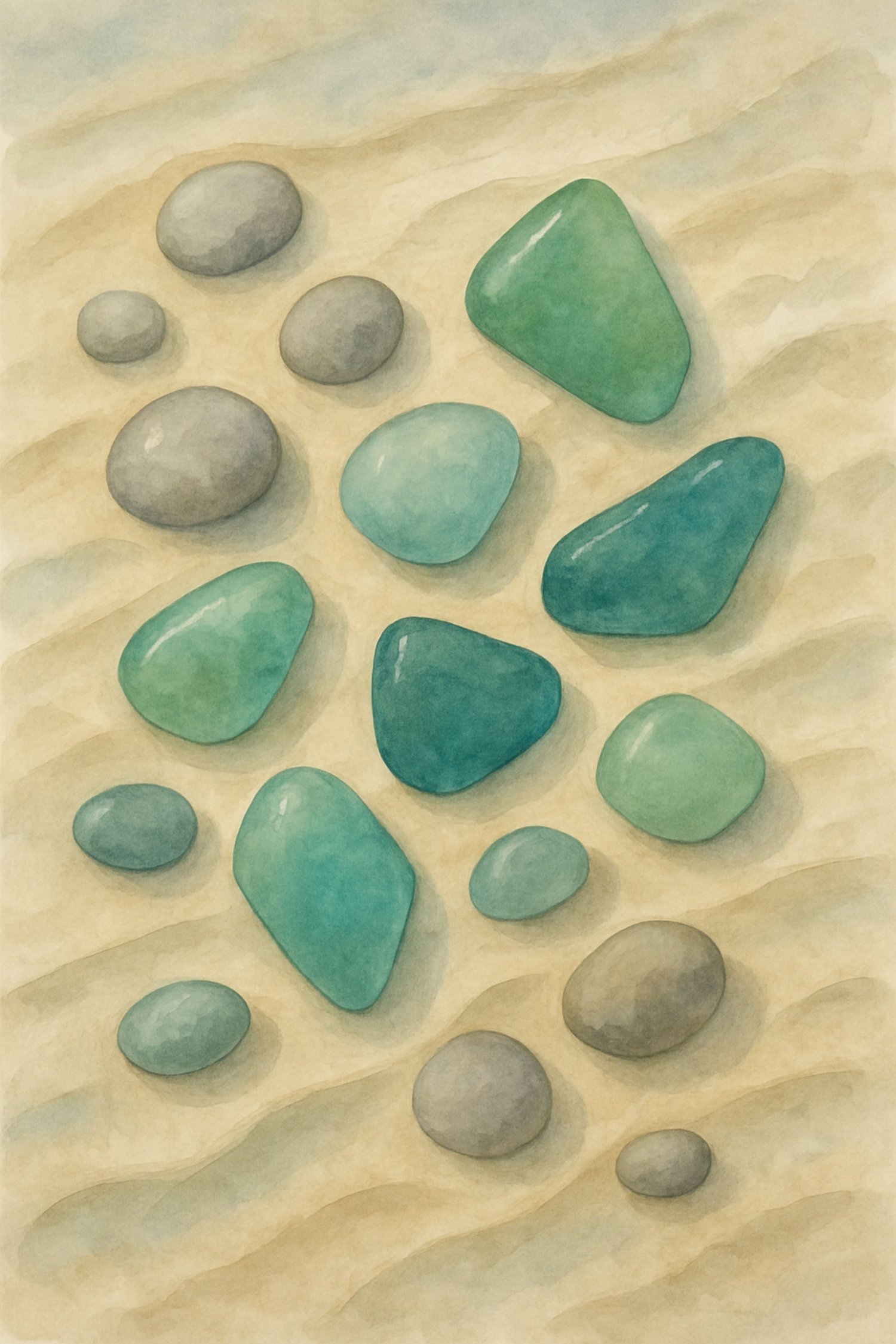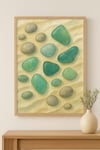 Bring the calm of the coast into your home with this gentle watercolor artwork. Featuring ocean-washed sea glass and smooth pebbles resting on sunlit sand, this piece evokes simplicity, clarity, and nature’s quiet beauty. A soothing addition to any space, it fits beautifully in beach-inspired or minimal interiors.