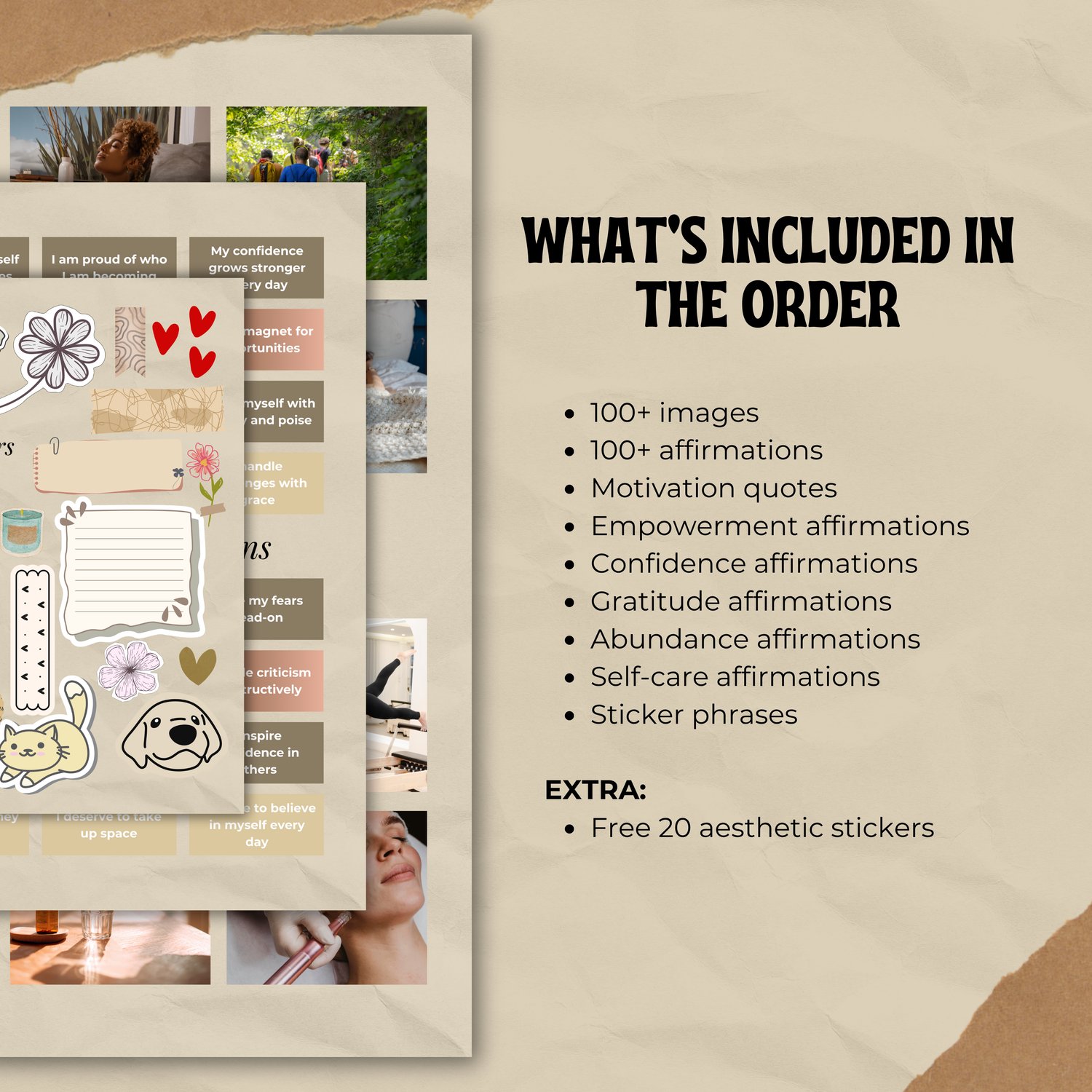 Inside, you’ll find a beautifully crafted collection of vision board pages focusing on themes like confidence, motivation, abundance, and self-love, plus a variety of aesthetic and affirmation stickers like “You are amazing” and “I trust my inner strength.”