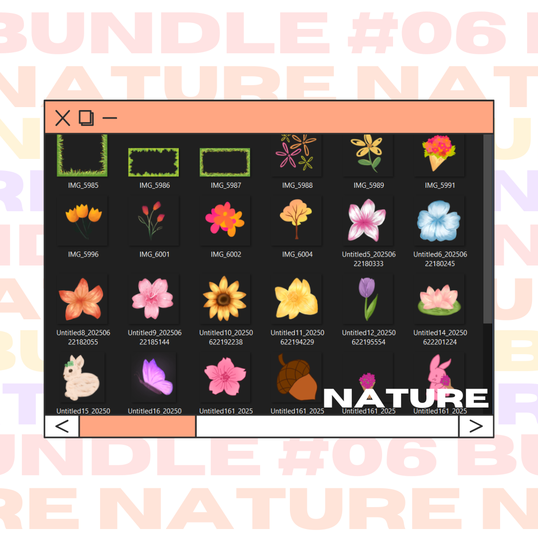 This bundle includes 32 different nature-themed overlays (animals, grass, flowers) that can be used to enhance your design.