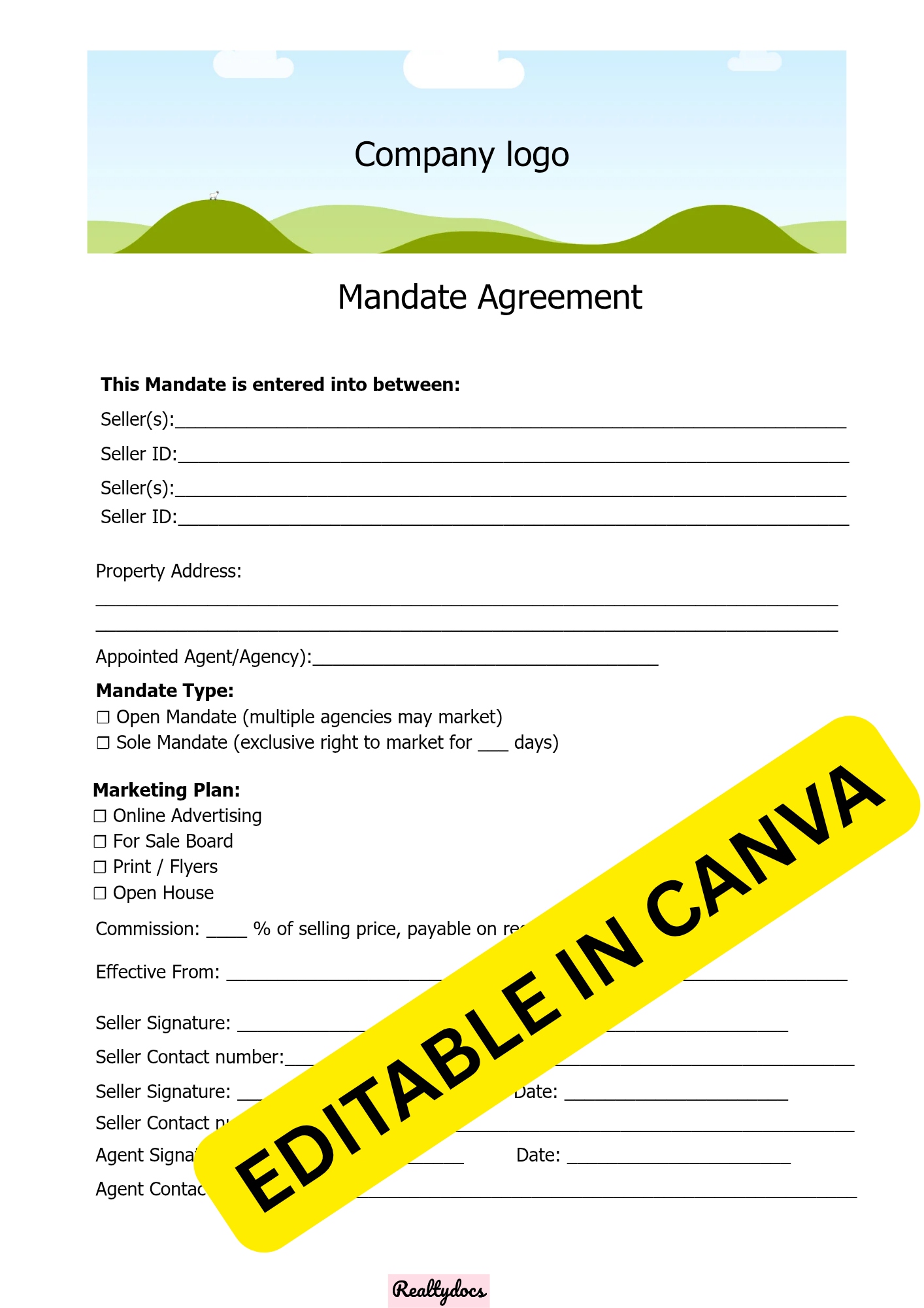 Editable mandate template to formalize agreements with sellers while staying clear and professional. Helps establish trust and compliance.