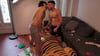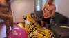 They blow a zebra 32" printed cattex balloon and burst other safari cattex printed 32" balloons and green GL balloons.