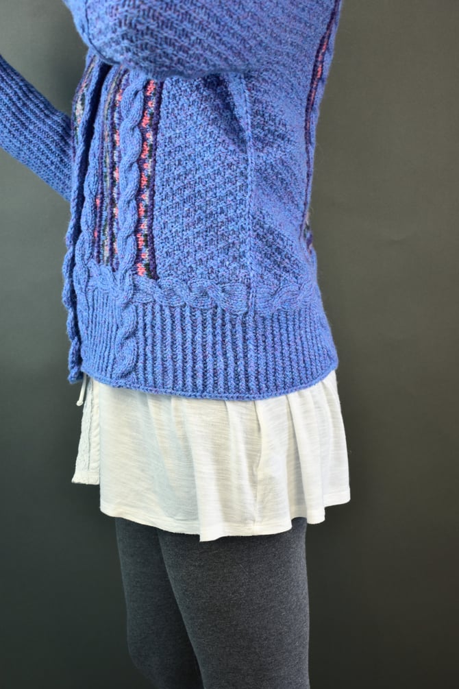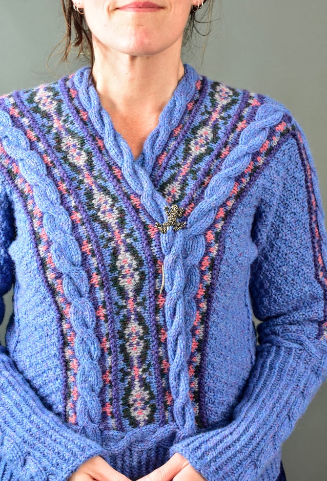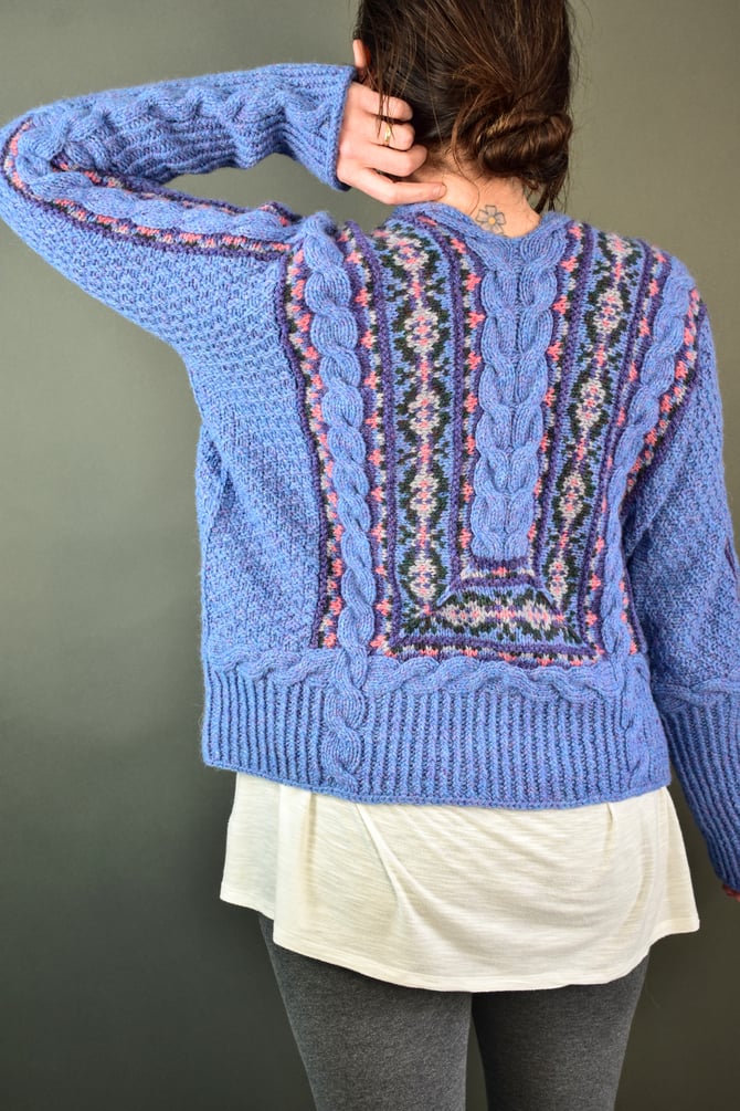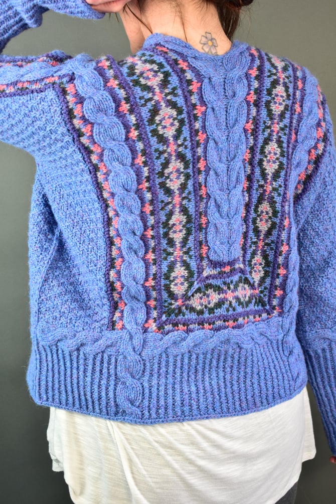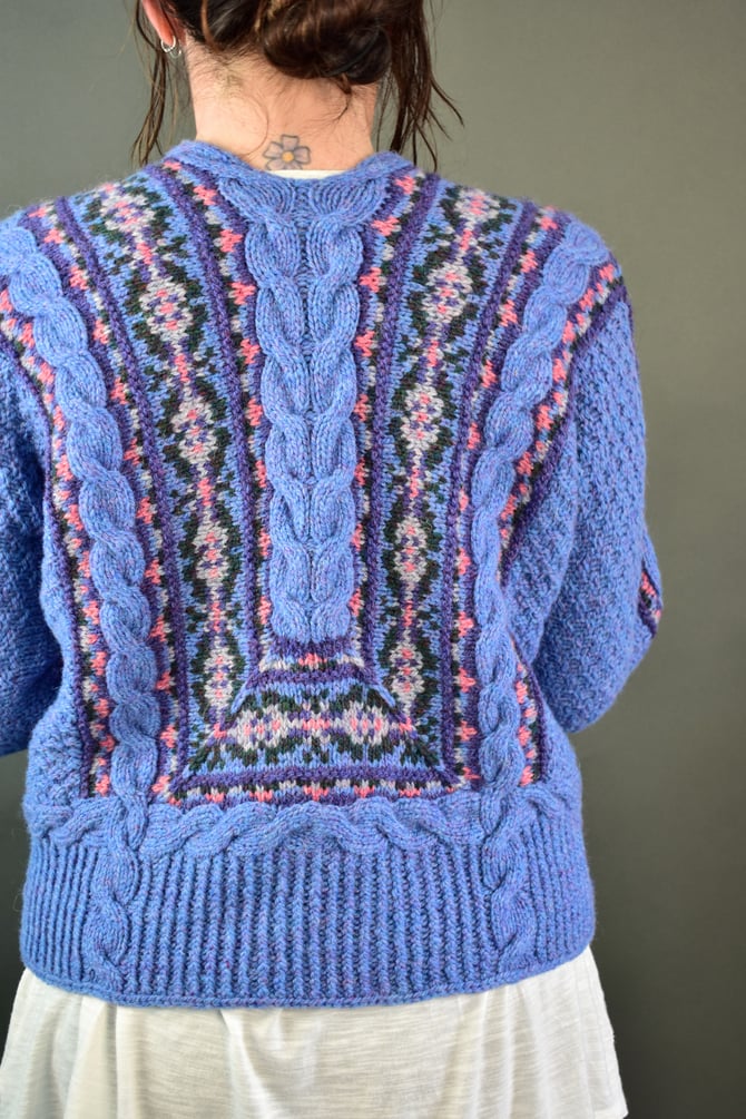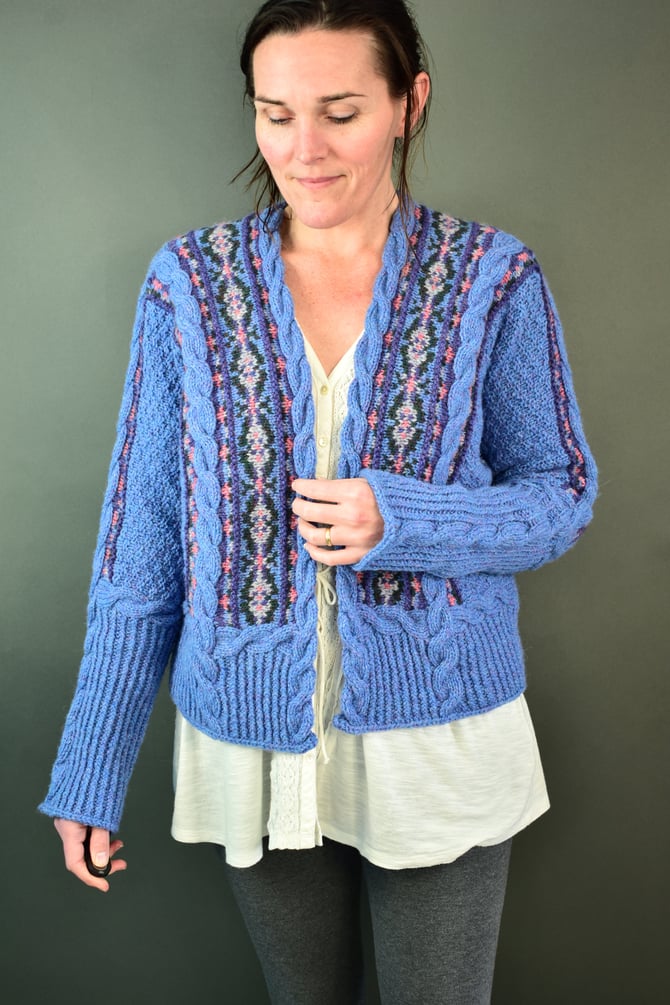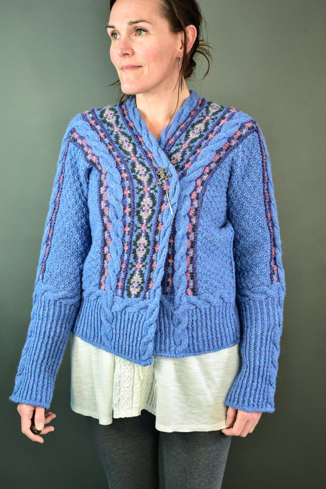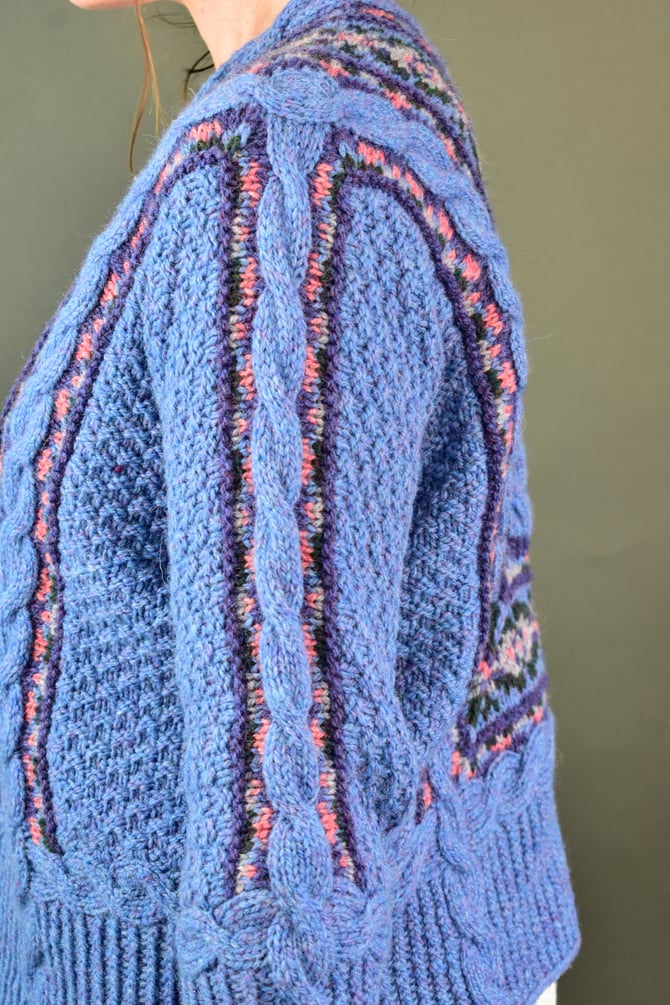 The cables truly do begin it all and provide the foundation for the entire cardigan. After the cables are worked. Stitches are picked up and the main centre Fair Isle on the front and miter on the back is worked in the round with one steek at the hem. The centre cable on the back is worked upwards, split at the neck and then travels down the front and sewn to the edges of the Fair Isle. Stitches are picked up and the little outer bands of mitered Fair Isle that travel down the sleeves are worked flat. The moss stitch covering the body is worked from top-down and is sewn to the edges of the Fair Isle. Sleeve sts are joined with a 3-needle BO. The hem cable borders are worked, then the hem ribbing is continued down to desired length. The sleeve cuff cable border is worked, then the cuff ribbing is continued down to desired length.