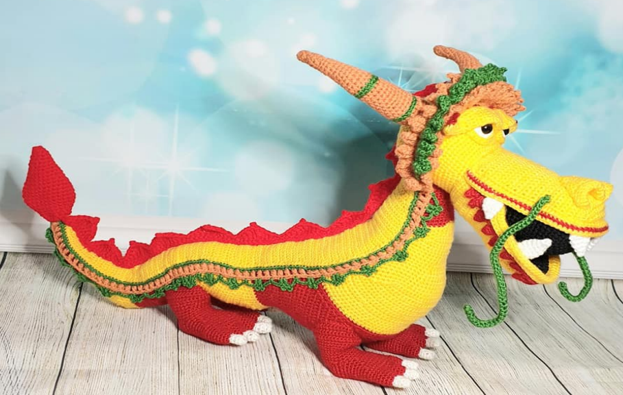We would like to introduce to you 'Chloe The Chinese Dragon' she's made up of basic stitches and rounds, is worked in DK (8PLY), stands at approximately 26" in length and is written in U.S Terminology, a list of materials on how to work the dragon is listed in the pattern,