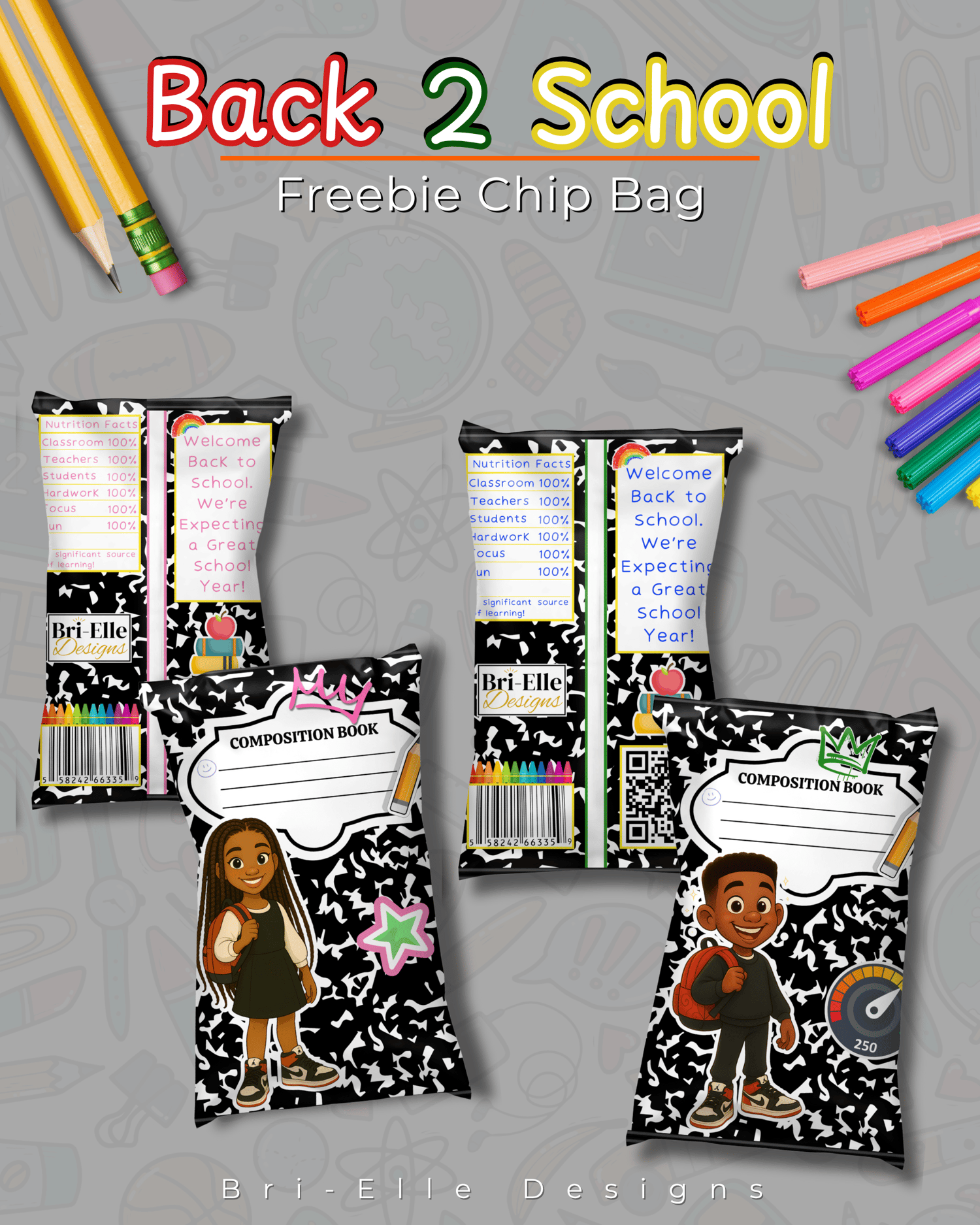 Includes chip bag wrappers + juice pouch labels in a cute composition book theme. 🎒✏️