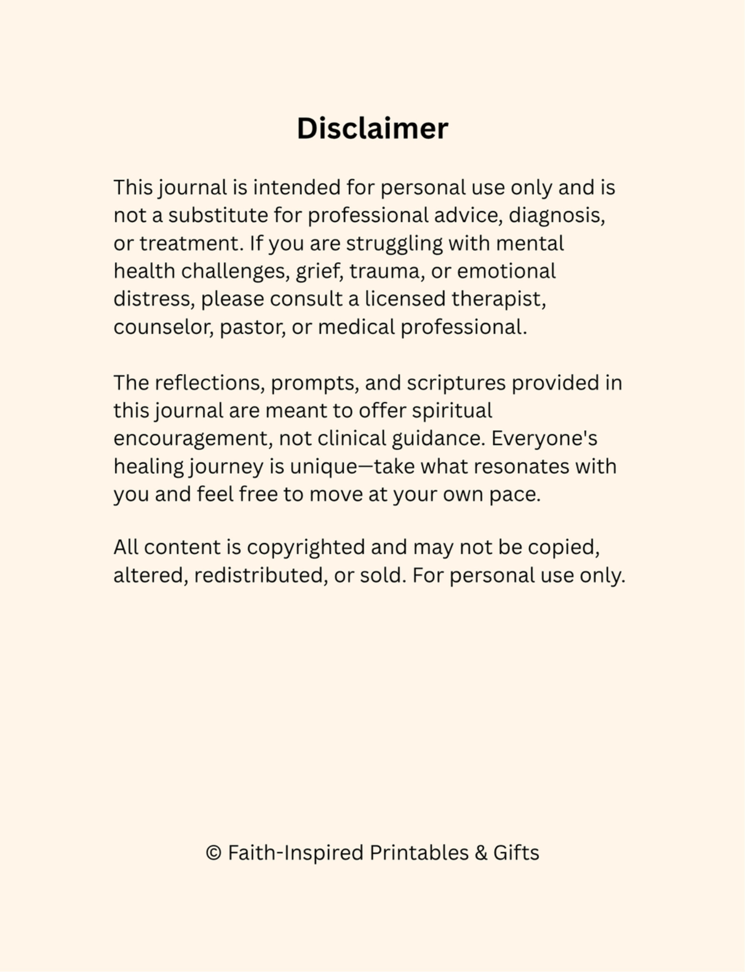This journal is a companion for your emotional and spiritual journey—not a substitute for professional therapy or medical mental health care. If you’re feeling overwhelmed, please reach out to a counselor or mental health expert for support.