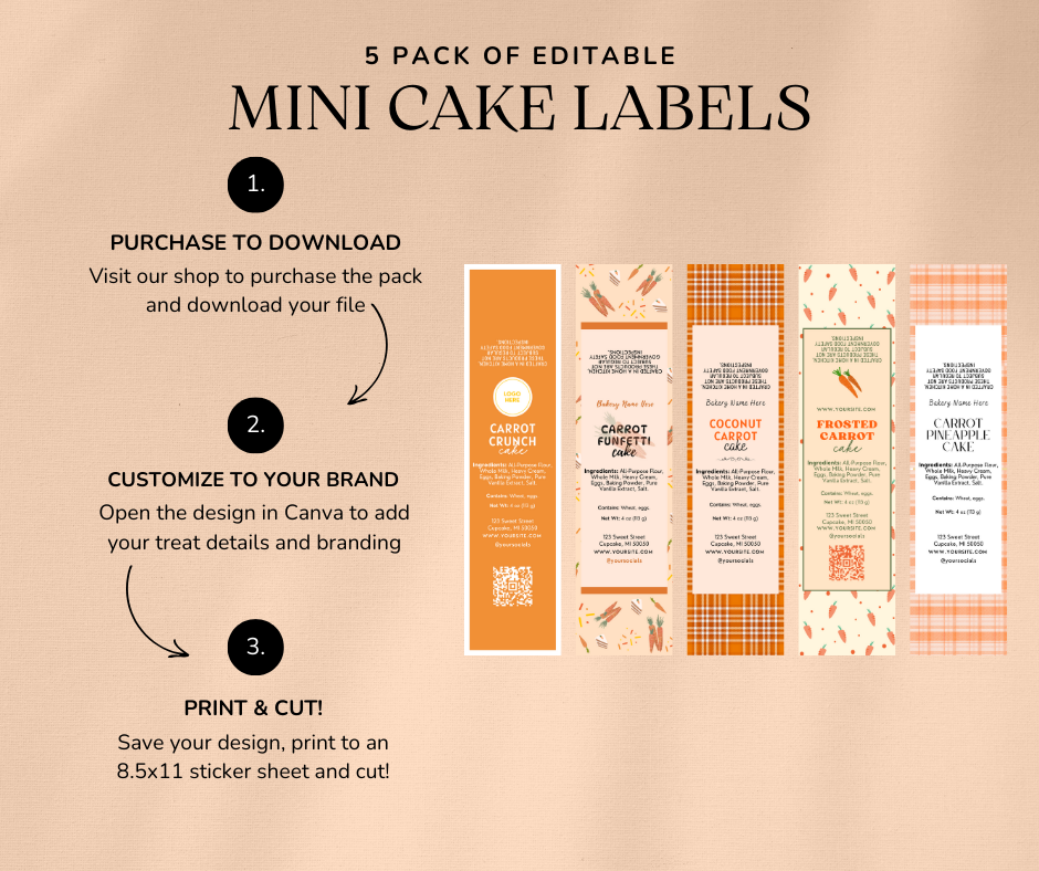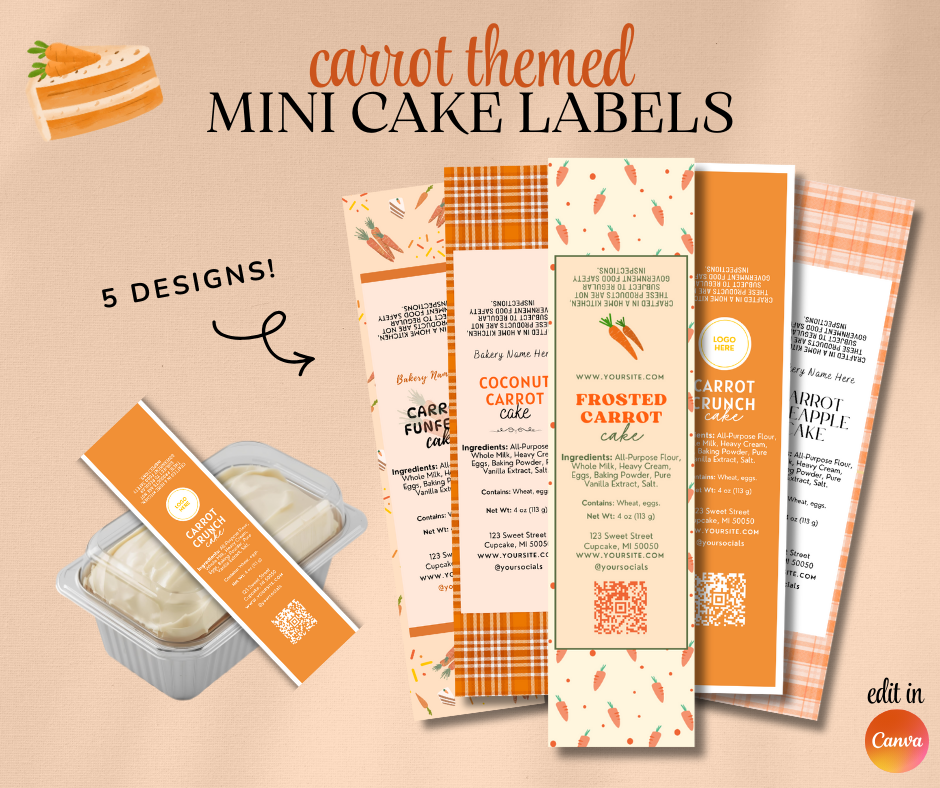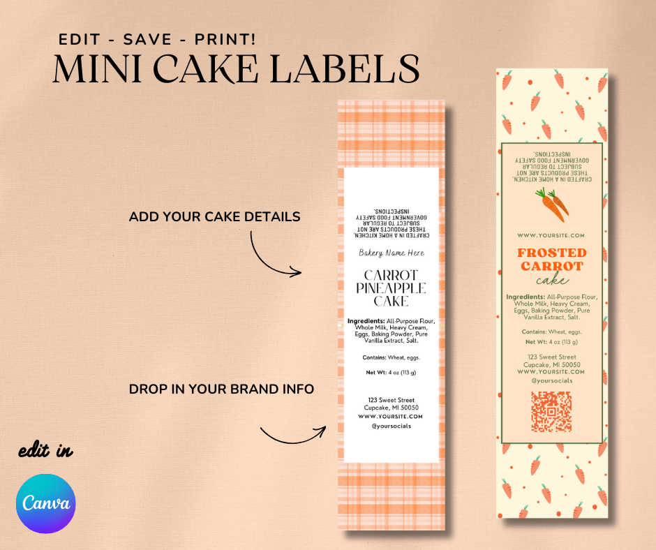 Bring cozy charm to your sweets with this carrot cake themed label pack! Perfect for spring markets, Easter sales, or year-round carrot cake lovers, these editable Canva templates make your mini cakes look polished and professional in seconds. Each design includes space for your bakery name, ingredients, net weight, allergen info, and “best by” date — so you stay compliant and stylish.