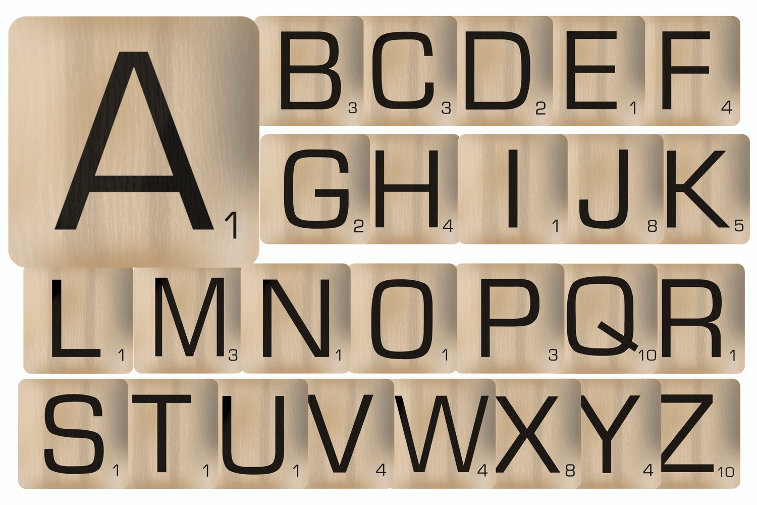 Scrabble tiles. 26 individual letters plus blank - you could add a paw print for a special pet, or use it as a + or & for example.