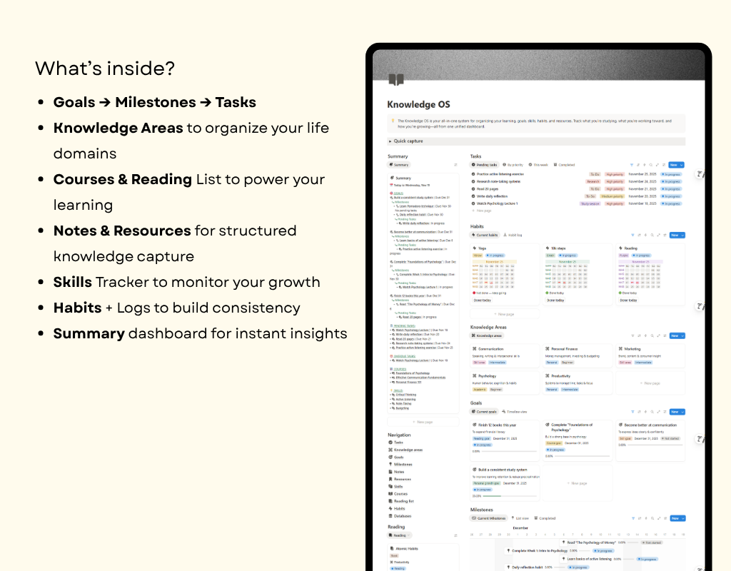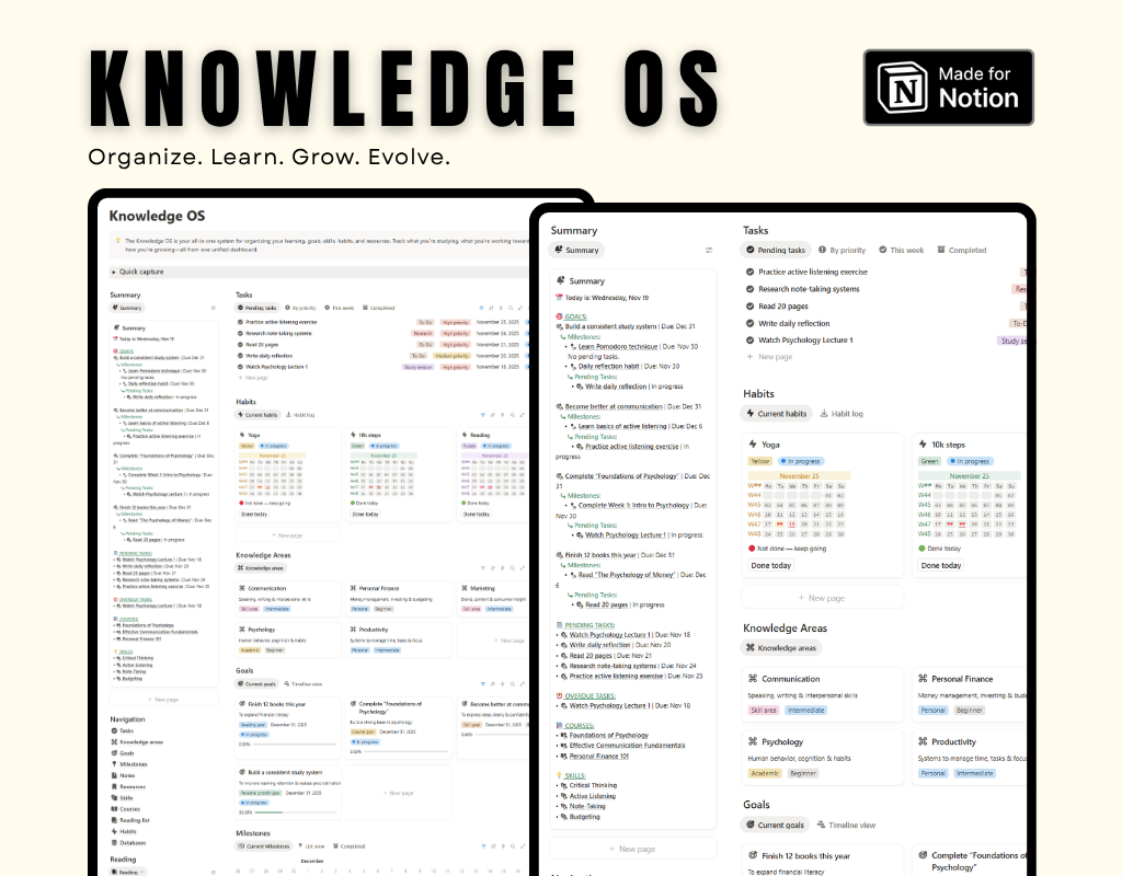 Knowledge OS is a complete system designed to help you organize what you learn, structure your growth, and manage your personal development with clarity. It brings together your goals, habits, skills, knowledge areas, and learning materials into one integrated workspace, allowing you to study, reflect, and improve with intention.