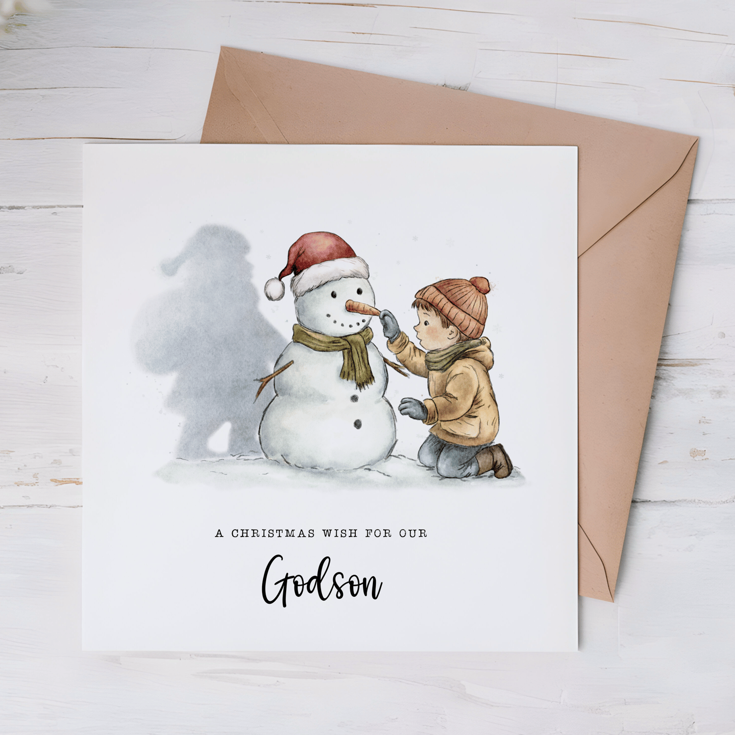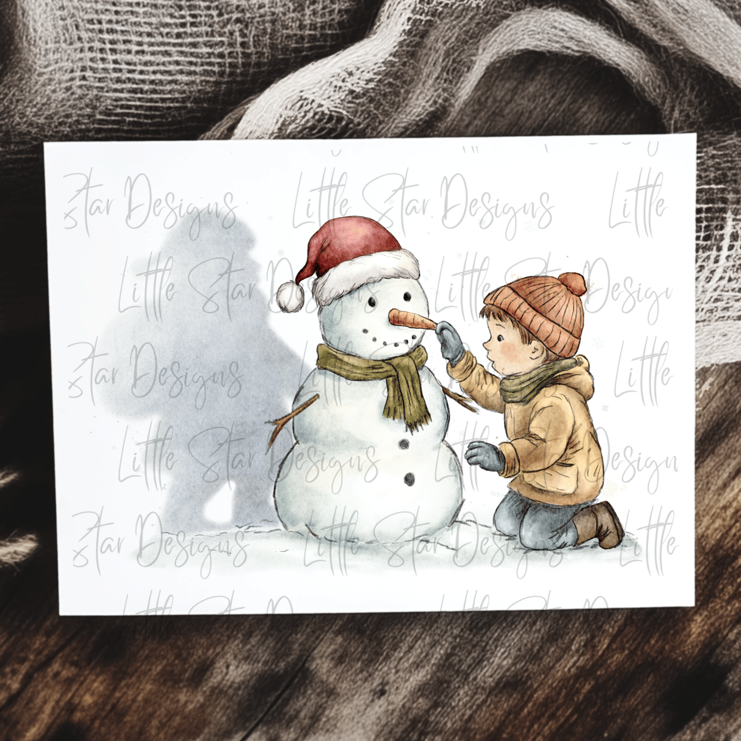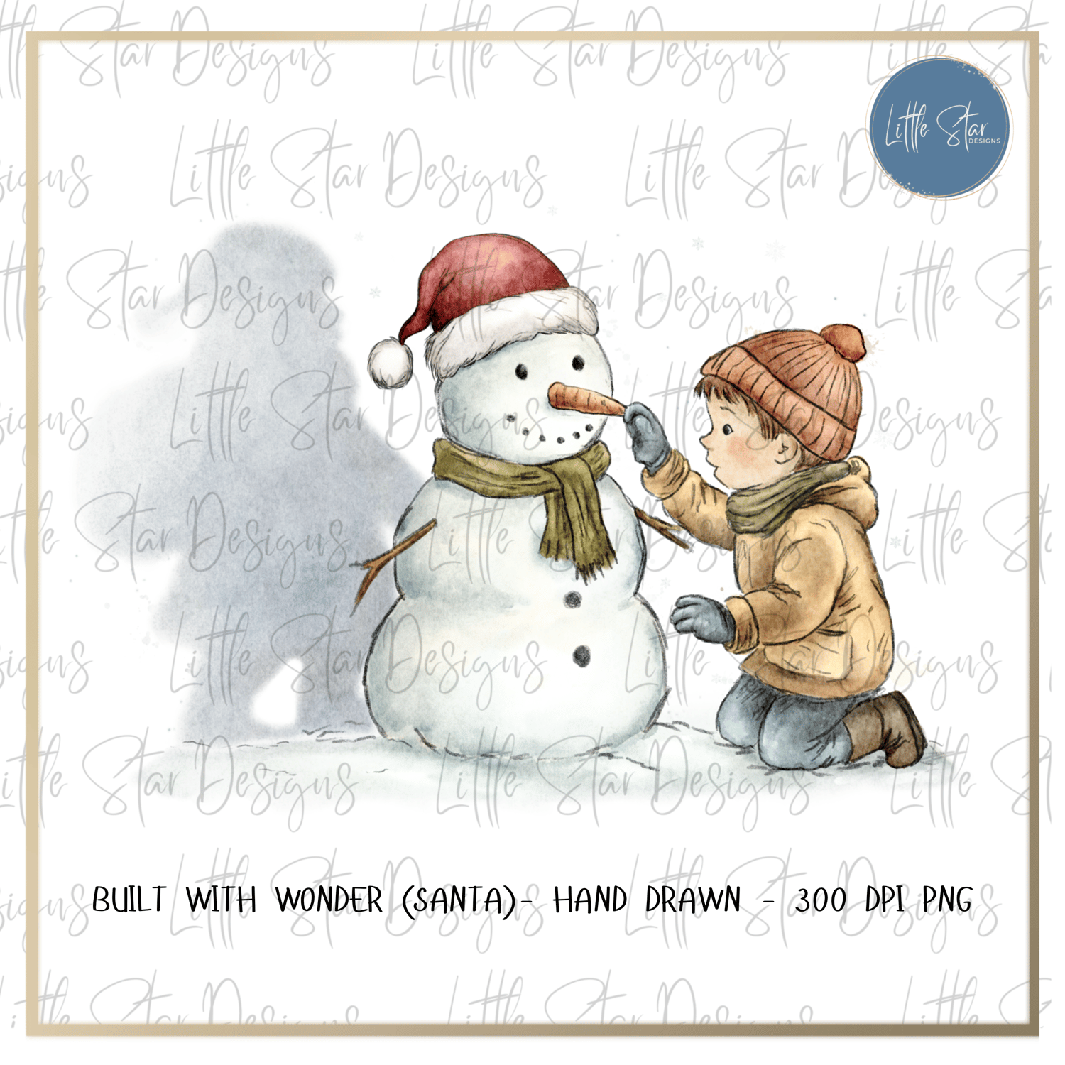 ⭐️ 1 Illustration of a little boy building a snowman with shadow cast as Santa