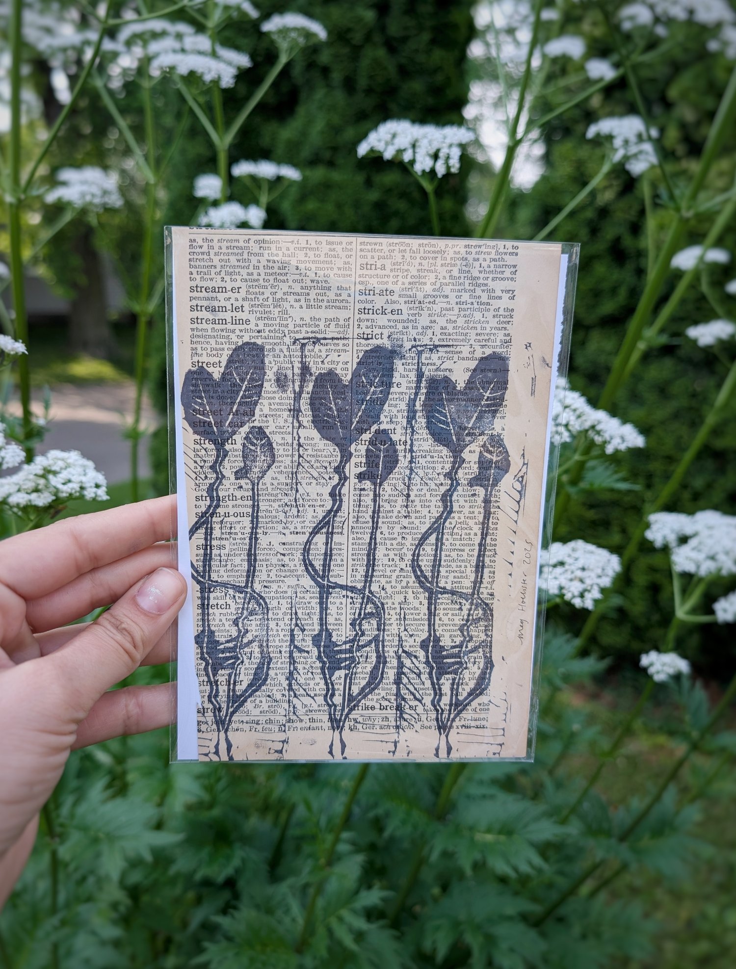 5x7 inch hand illustrated linocut print on vintage illustrated dictionary pages. These pieces are truly one of a kind- due to the nature of book pages and the nature of lincout prints, each print is going to look a bit different and feature slightly different book page illustrations.