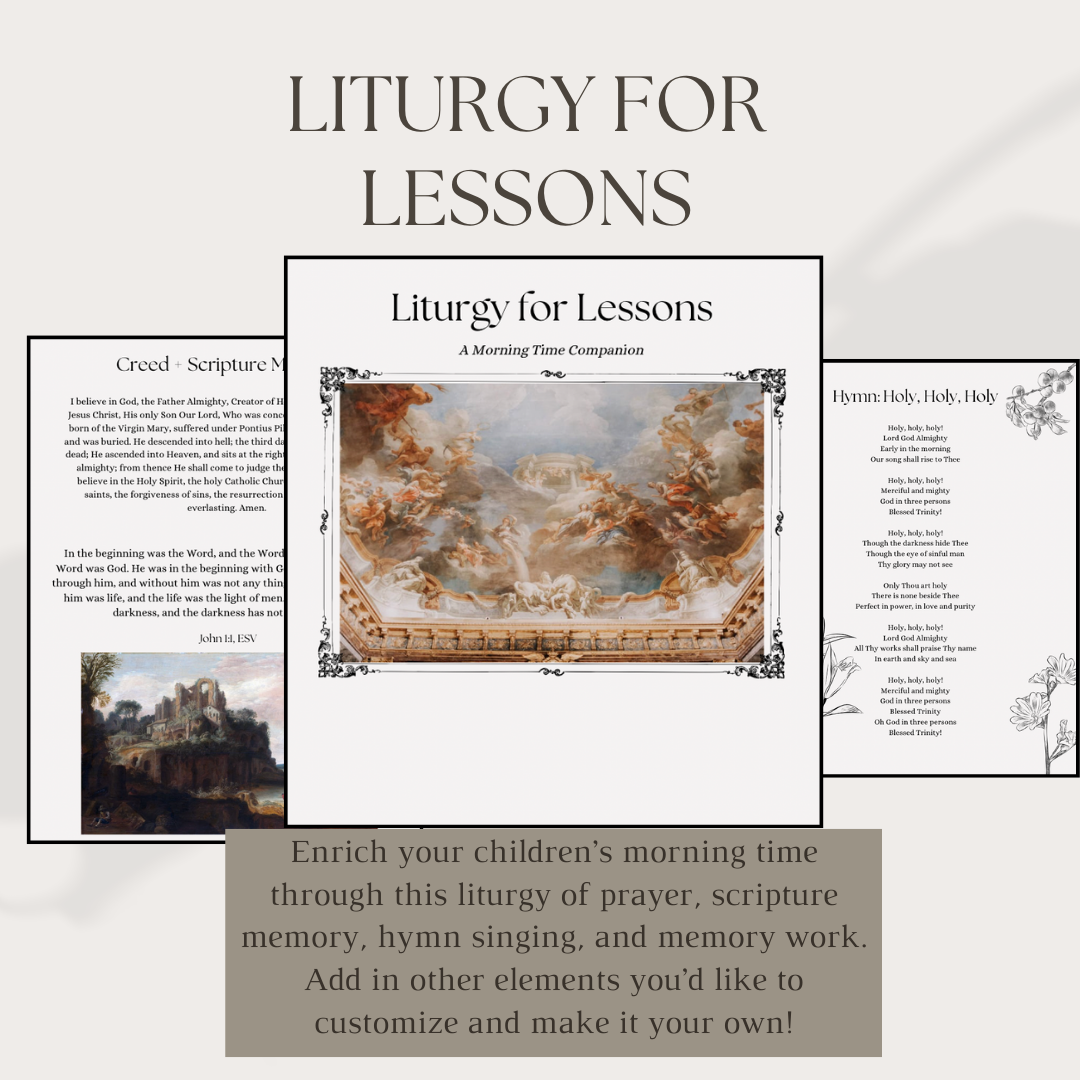 This beautiful guide helps you lead your children through a liturgy of worship and beauty during Morning Time. You can customize it to include your selected memory verses, catechisms, or any other recitation work. I've included a full starting guide that can be printed and used today, or spend more time customizing it with your own memory work.
