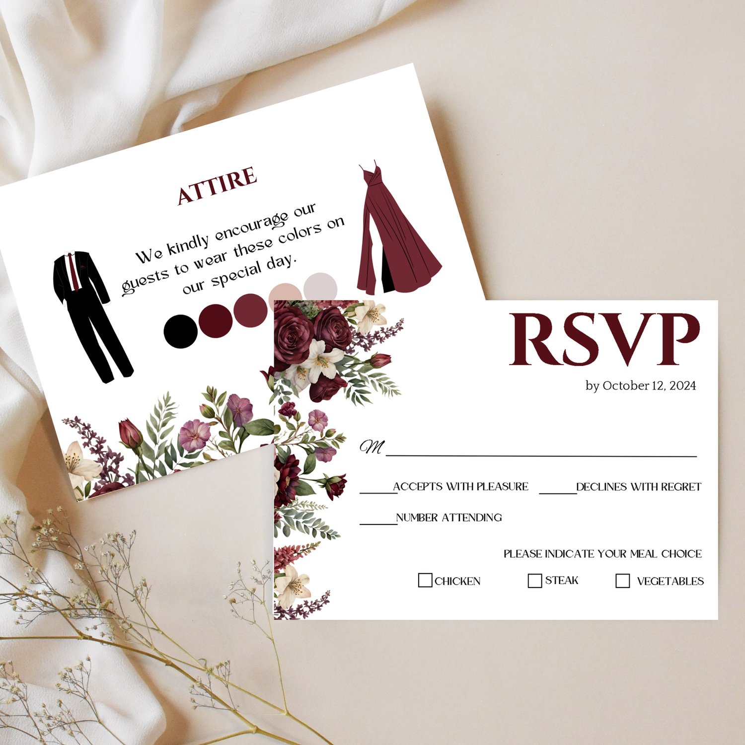 Create a cohesive and stunning look for your wedding with our Elegant Maroon/Burgundy Wedding Invitation Suite. Order now and start bringing your wedding vision to life!