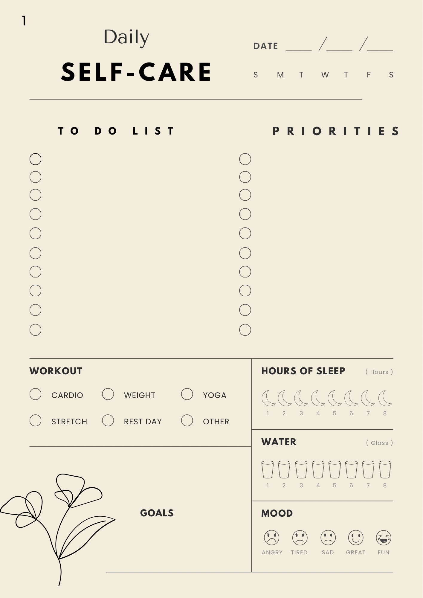 Create a weekly self-care schedule, track your habits, and set mindful intentions.
