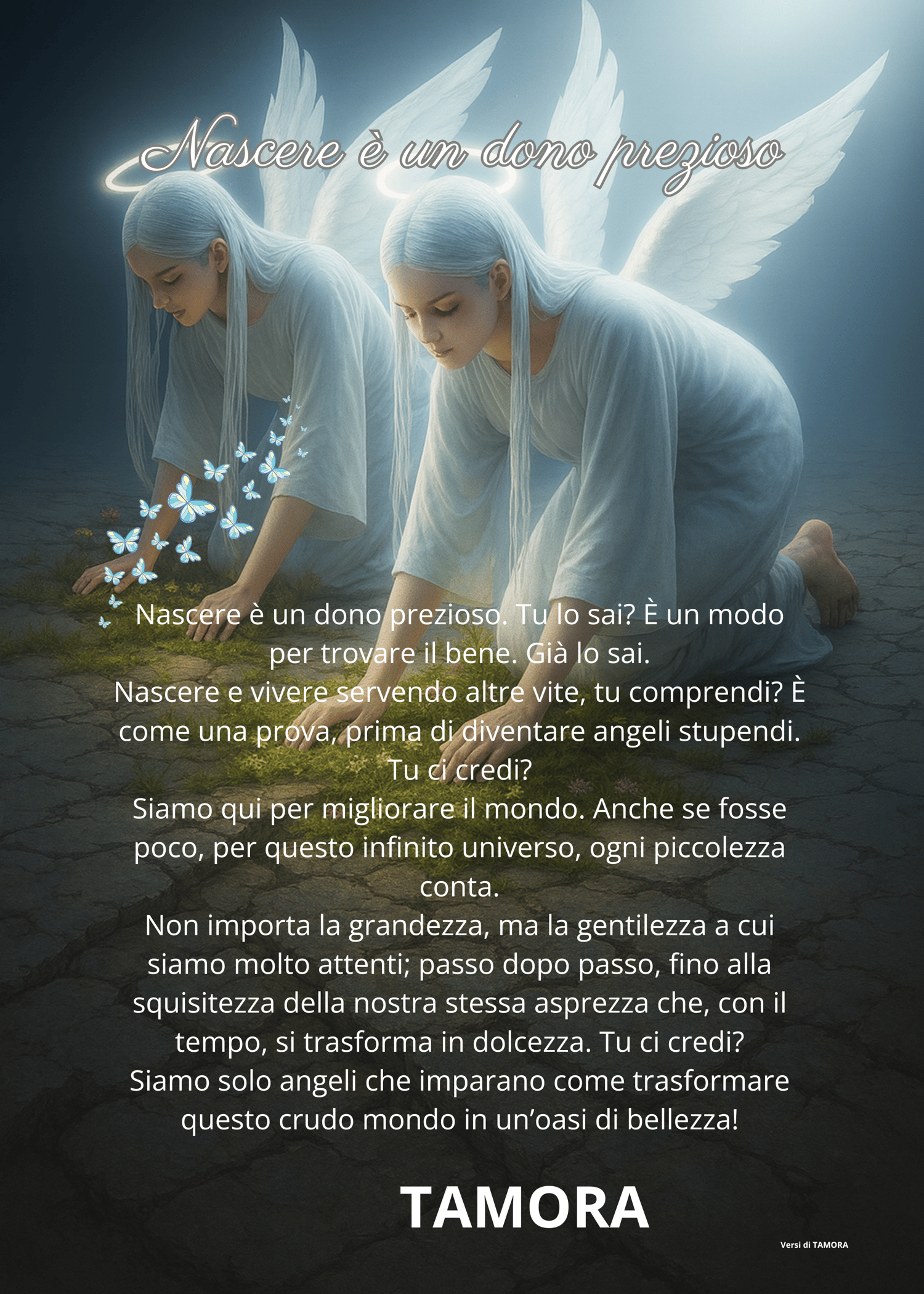 🖋 Poem Excerpt: Nascere è un dono prezioso… Siamo solo angeli che imparano a trasformare questo mondo in un’oasi di bellezza.