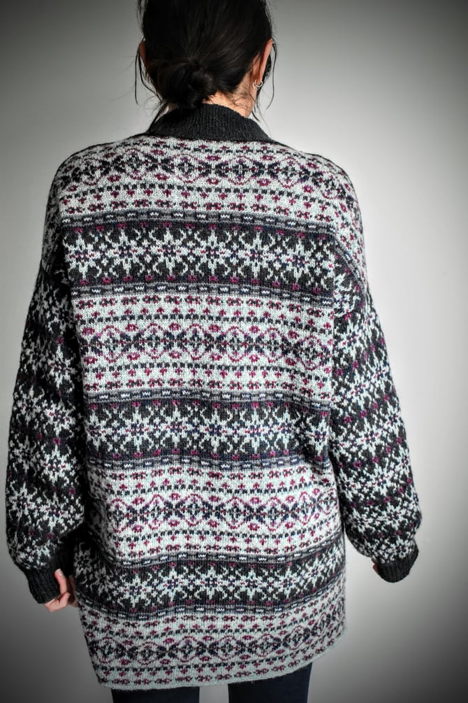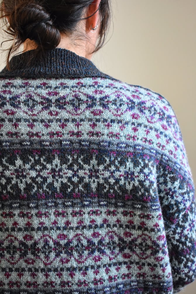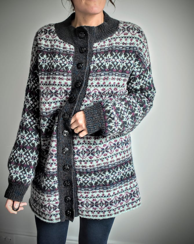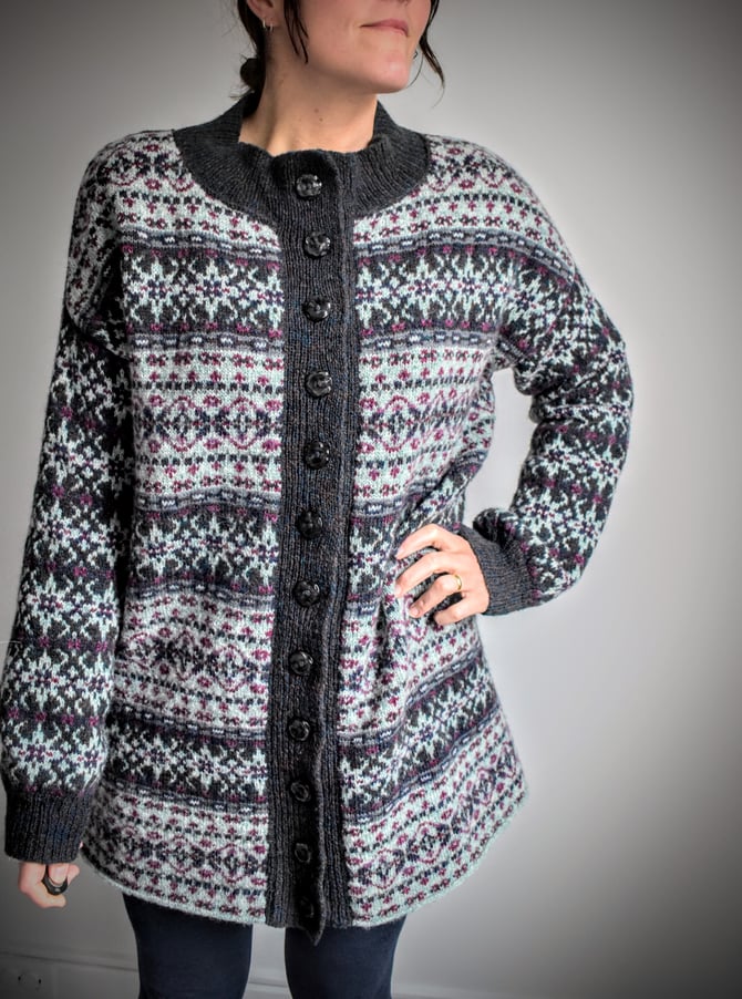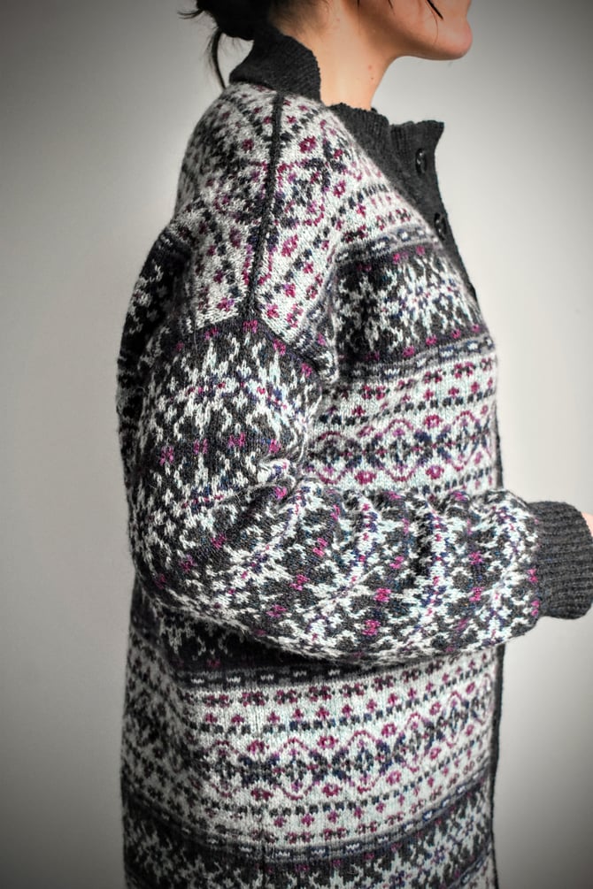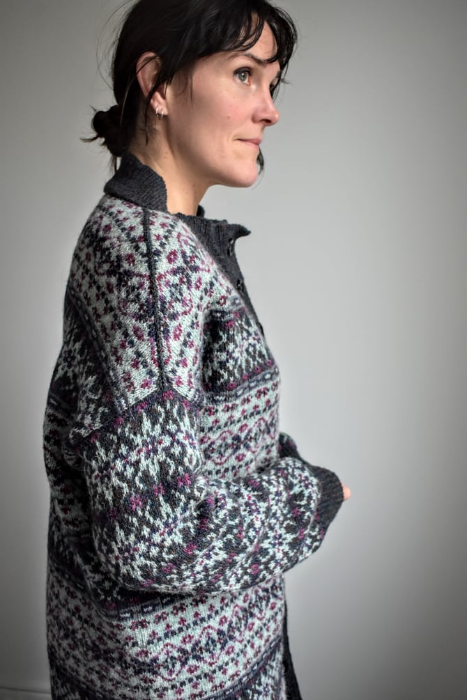 Meadows is a beautifully oversized and patterned coat, featuring modified drop shoulders and a vertically knit button band. The body of the coat is worked bottom up and in the round with a steek at the center front opening and a steek at each armhole. Stitches are bound off at the shoulders to create shoulder shaping, then the shoulders are joined with a visible 3-needle BO. The neckband is CO and worked flat before joining to the neckline with another 3-needle BO, then the ribbing is continued vertically down through the buttonhole band and the button band to the hem. The buttonhole and button bands are sewn onto the body, then an Icelandic BO finishes the hem. Lastly, the sleeves are worked in the round from the armhole to the cuff.