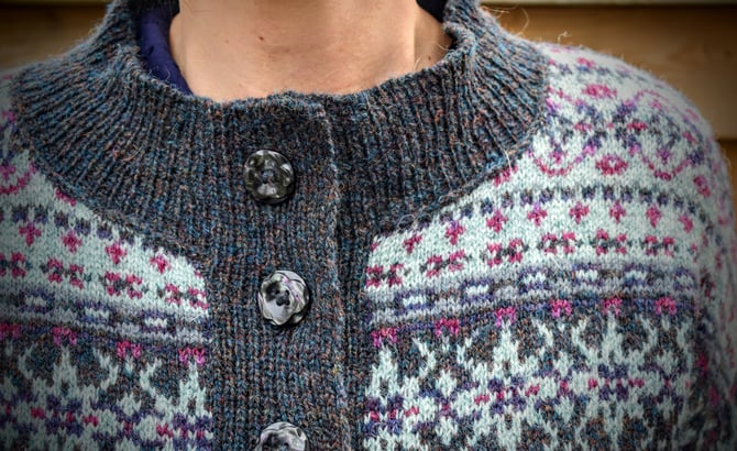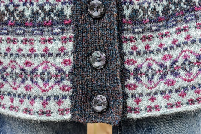 You will also need: 12 buttons sized at 2.5cm / 1” diameter; either a crochet hook and yarn, darning needle and thin yarn/thread, or felting tool and board for reinforcing steeks; scissors for cutting steeks; spare interchangeable cables, spare needles or scrap yarn for holding stitches; stitch markers.