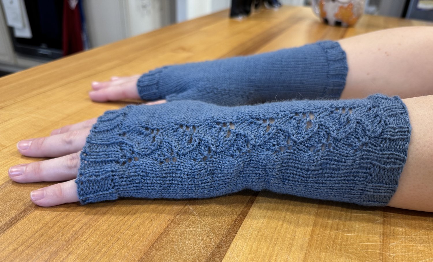 Techniques: Knitting in the round, thumb, decreases, increases, knitting stitches together, knitting through the back loop, picking up stitches.