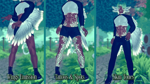 • Hair hue & constant • Outfit hue & constant • Metal hue & constant • Wing emission hue & constant • Tattoo hue & constant
