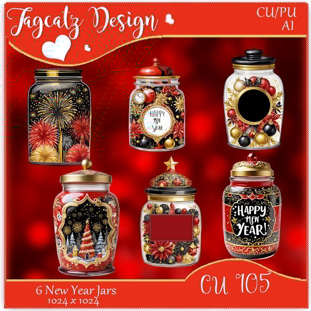 6 jars fill with New Year's decorations. AI generated by me. 1024 x 1024, saved at 300dpi. CU or PU.